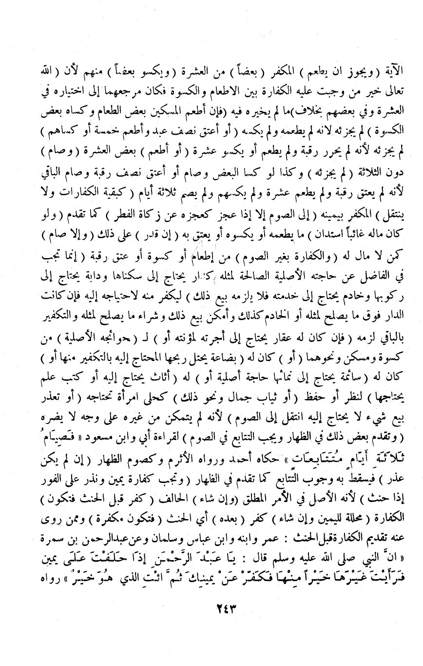 (لَمْ يُجْزِئْهُ) وَكَذَا لَوْ كَسَا الْبَعْضَ وَصَامَ أَوْ أَعْتَقَ نِصْفَ رَقَبَةٍ وَصَامَ الْبَاقِي لِأَنَّهُ لَمْ يُعْتِقْ رَقَبَةً وَلَمْ يُطْعِمْ عَشَرَةً وَلَمْ يَكْسُهُمْ وَلَمْ يَصُمْ ثَلَاثَةَ أَيَّامٍ (كَبَقِيَّةِ الْكَفَّارَاتِ وَلَا يَنْتَقِلُ) الْمُكَفِّرُ بِيَمِينِهِ (إلَى الصَّوْمِ إلَّا إذَا عَجِزَ كَعَجْزِهِ عَنْ زَكَاةِ الْفِطْرِ) كَمَا تَقَدَّمَ (وَلَوْ كَانَ مَالُهُ غَائِبًا اسْتَدَانَ) مَا يُطْعِمُهُ أَوْ يَكْسُوهُ أَوْ يُعْتِقُ بِهِ (إنْ قَدَرَ) عَلَى ذَلِكَ (وَإِلَّا صَامَ) كَمَنْ لَا مَال لَهُ (وَالْكَفَّارَةُ بِغَيْرِ الصَّوْمِ) مِنْ إطْعَامٍ أَوْ كُسْوَةٍ أَوْ عِتْقِ رَقَبَةٍ (إنَّمَا تَجِبُ فِي الْفَاضِلِ عَنْ حَاجَتِهِ الْأَصْلِيَّةِ الصَّالِحَةِ لِمِثْلِهِ كَدَارٍ يَحْتَاجُ إلَى سُكْنَاهَا وَدَابَّةٍ يَحْتَاجُ إلَى رُكُوبِهَا وَخَادِمٍ يَحْتَاجُ إلَى خِدْمَتِهِ فَلَا يَلْزَمُهُ بَيْعُ ذَلِكَ) لِيُكَفِّرَ مِنْهُ لِاحْتِيَاجِهِ إلَيْهِ فَإِنْ كَانَتْ الدَّارُ فَوْقَ مَا يَصْلُحُ لِمِثْلِهِ أَوْ الْخَادِمُ كَذَلِكَ وَأَمْكَنَ بَيْعُ ذَلِكَ وَشِرَاءُ مَا يَصْلُحُ لِمِثْلِهِ وَالتَّكْفِيرِ بِالْبَاقِي لَزِمَهُ.
