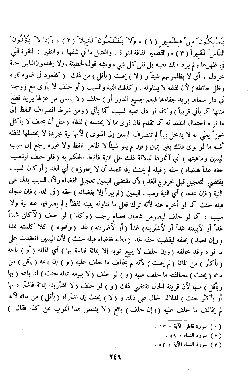 {وَلا يُظْلَمُونَ فَتِيلا} [النساء: ٤٩] {فَإِذًا لا يُؤْتُونَ النَّاسَ نَقِيرًا} [النساء: ٥٣] وَالْقِطْمِيرُ لُفَافَةُ النَّوَاةِ، وَالْفَتِيلُ مَا فِي شِقِّهَا، وَالنَّقِيرُ: النَّقْرَةُ الَّتِي فِي ظَهْرِهَا وَلَمْ يُرِدْ ذَلِكَ بِعَيْنِهِ بَلْ نَفَى كُلَّ شَيْءٍ وَمِثْلُهُ قَوْلُ الْحُطَيْئَةِ