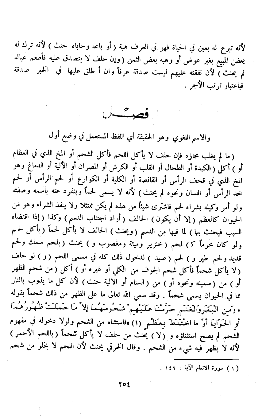 (وَ) لَوْ حَلَفَ (لَا يَأْكُلُ شَحْمًا فَأَكَلَ شَحْمَ الْجَوْفِ مِنْ الْكُلَى أَوْ غَيْرِهِ أَوْ) أَكَلَ (مِنْ شَحْمِ الظَّهْرِ أَوْ) مِنْ (سَمِينِهِ وَنَحْوِهِ أَوْ) مِنْ (السَّنَامِ أَوْ الْأَلْيَةِ حَنِثَ) لِأَنَّ كُلَّ مَا يُذَوَّبَ بِالنَّارِ مِمَّا فِي الْحَيَوَانِ يُسَمَّى شَحْمًا وَقَدْ سَمَّى اللَّهُ تَعَالَى مَا عَلَى الظَّهْرِ مِنْ ذَلِكَ شَحْمًا بِقَوْلِهِ {وَمِنَ الْبَقَرِ وَالْغَنَمِ حَرَّمْنَا عَلَيْهِمْ شُحُومَهُمَا إِلا مَا حَمَلَتْ ظُهُورُهُمَا أَوِ الْحَوَايَا أَوْ مَا اخْتَلَطَ بِعَظْمٍ} [الأنعام: ١٤٦] فَاسْتَثْنَاهُ مِنْ الشَّحْمِ وَلَوْلَا دُخُولُهُ فِي مَفْهُومِ الشَّحْمِ لَمْ يَصِحَّ اسْتِثْنَاؤُهُ وَ (لَا) يَحْنَثْ مَنْ حَلَفَ لَا يَأْكُلُ شَحْمًا (بِاللَّحْمِ الْأَحْمَرِ) لِأَنَّهُ لَا يَظْهَرُ فِيهِ شَيْءٌ مِنْ الشَّحْمِ.