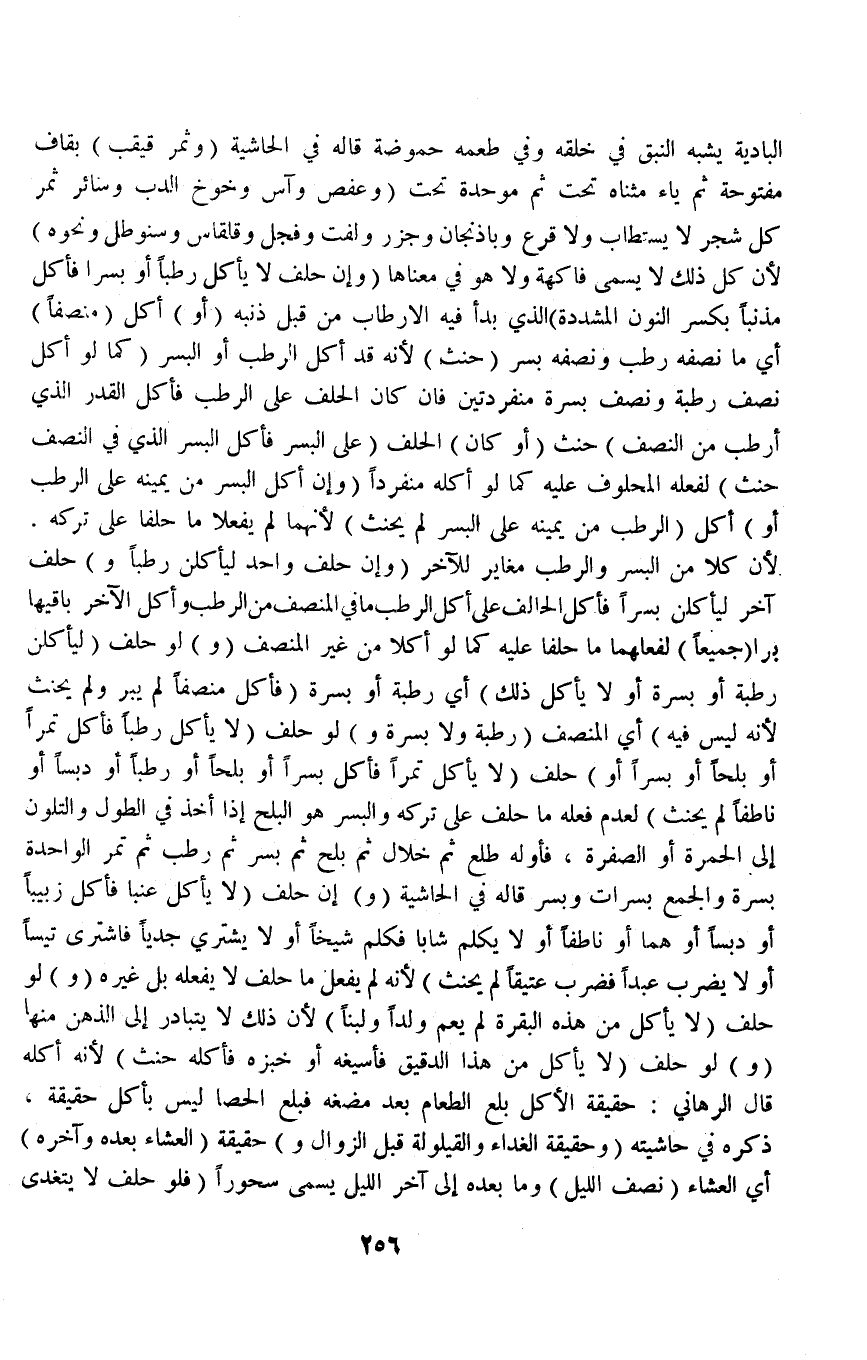 (وَ) لَوْ حَلَفَ (لِيَأْكُلَنَّ رُطَبَةً أَوْ بُسْرَةً أَوْ لَا يَأْكُلُ ذَلِكَ) أَيْ رُطَبَةً أَوْ بُسْرَةً (فَأَكَلَ مُنَصَّفًا لَمْ يَبَرَّ وَلَمْ يَحْنَثْ لِأَنَّهُ لَيْسَ فِيهِ) أَيْ الْمُنَصَّفِ (رُطَبَةٌ وَلَا بُسْرَةٌ وَ) لَوْ حَلَفَ (لَا يَأْكُلُ رُطَبًا فَأَكَلُ تَمْرًا أَوْ بَلَحًا أَوْ بُسْرًا أَوْ) حَلَفَ (لَا يَأْكُلُ تَمْرًا فَأَكَلَ بُسْرًا أَوْ بَلَحًا أَوْ رُطَبًا أَوْ دِبْسًا أَوْ نَاطِفًا لَمْ يَحْنَثْ) لِعَدَمِ فِعْلِهِ مَا حَلَفَ عَلَى تَرْكِهِ وَالْبُسْرُ هُوَ الْبَلَحُ إذَا أَخَذَ فِي الطُّولِ وَالتَّلَوُّنِ إلَى الْحُمْرَةِ أَوْ الصُّفْرَةِ، فَأَوَّلُهُ طَلْعٌ ثُمَّ خِلَالٌ ثُمَّ بَلَحٌ ثُمَّ بُسْرٌ ثُمَّ رُطَبٌ ثُمَّ تَمْرٌ الْوَاحِدَة بُسْرَةٌ وَالْجَمْعُ بُسُرَاتٌ وَبُسَرٌ قَالَهُ فِي الْحَاشِيَةِ.
