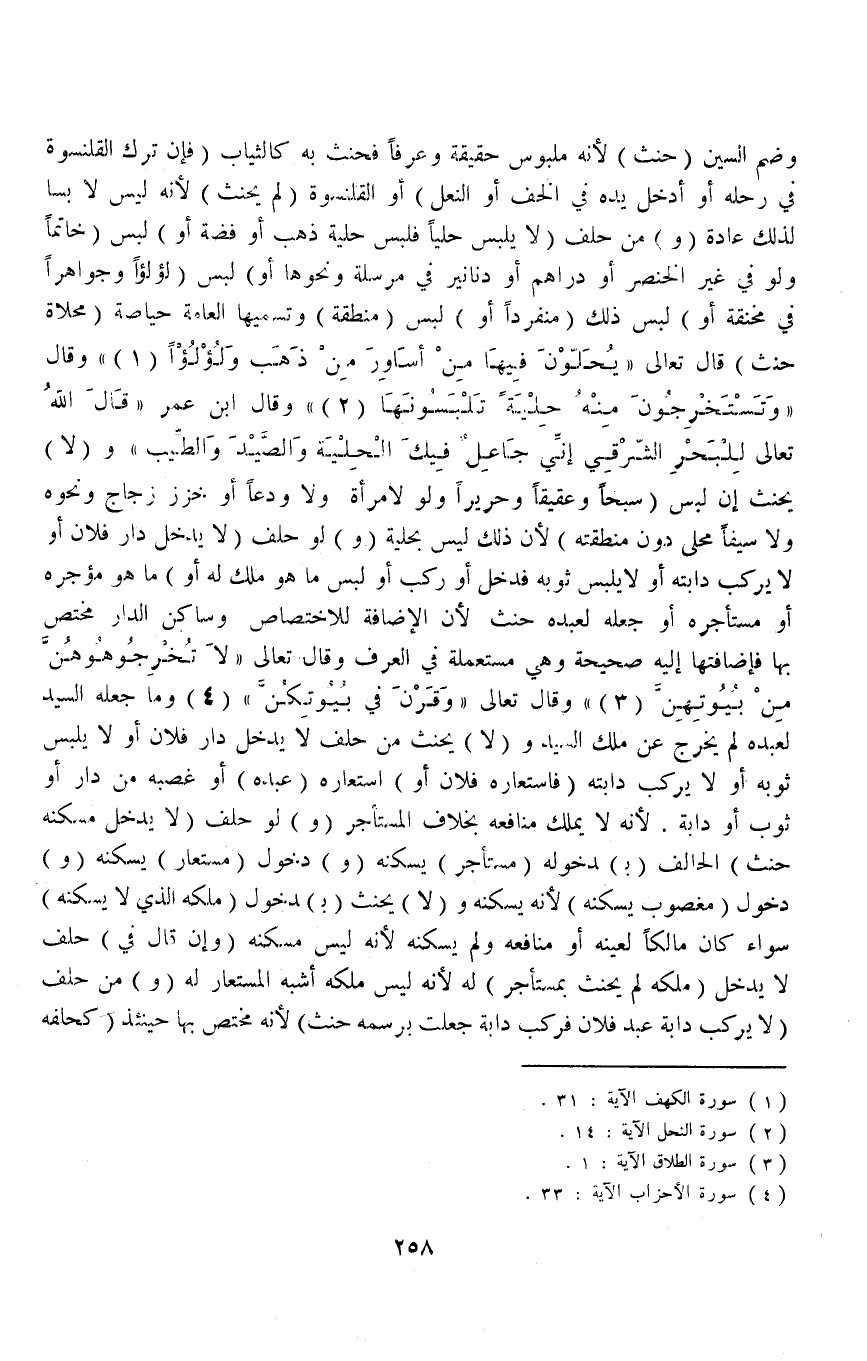 وَقَالَ {وَتَسْتَخْرِجُوا مِنْهُ حِلْيَةً تَلْبَسُونَهَا} [النحل: ١٤] وَقَالَ ابْنُ عُمَرَ " قَالَ اللَّهُ تَعَالَى لِلْبَحْرِ الشَّرْقِيِّ إنِّي جَاعِلٌ فِيكَ الْحِلْيَةَ وَالصَّيْدَ وَالطَّيِّبَ " وَ (لَا) يَحْنَثُ إنْ لَبِسَ (سَبْحًا وَعَقِيقًا وَحَرِيرًا وَلَوْ لِامْرَأَةٍ وَلَا وَدَعًا أَوْ خَرَزَ زُجَاجٍ وَنَحْوَهُ وَلَا سَيْفًا مُحَلَّى دُونَ مِنْطَقَتِهِ) لِأَنَّ ذَلِكَ لَيْسَ بِحِلْيَةٍ.