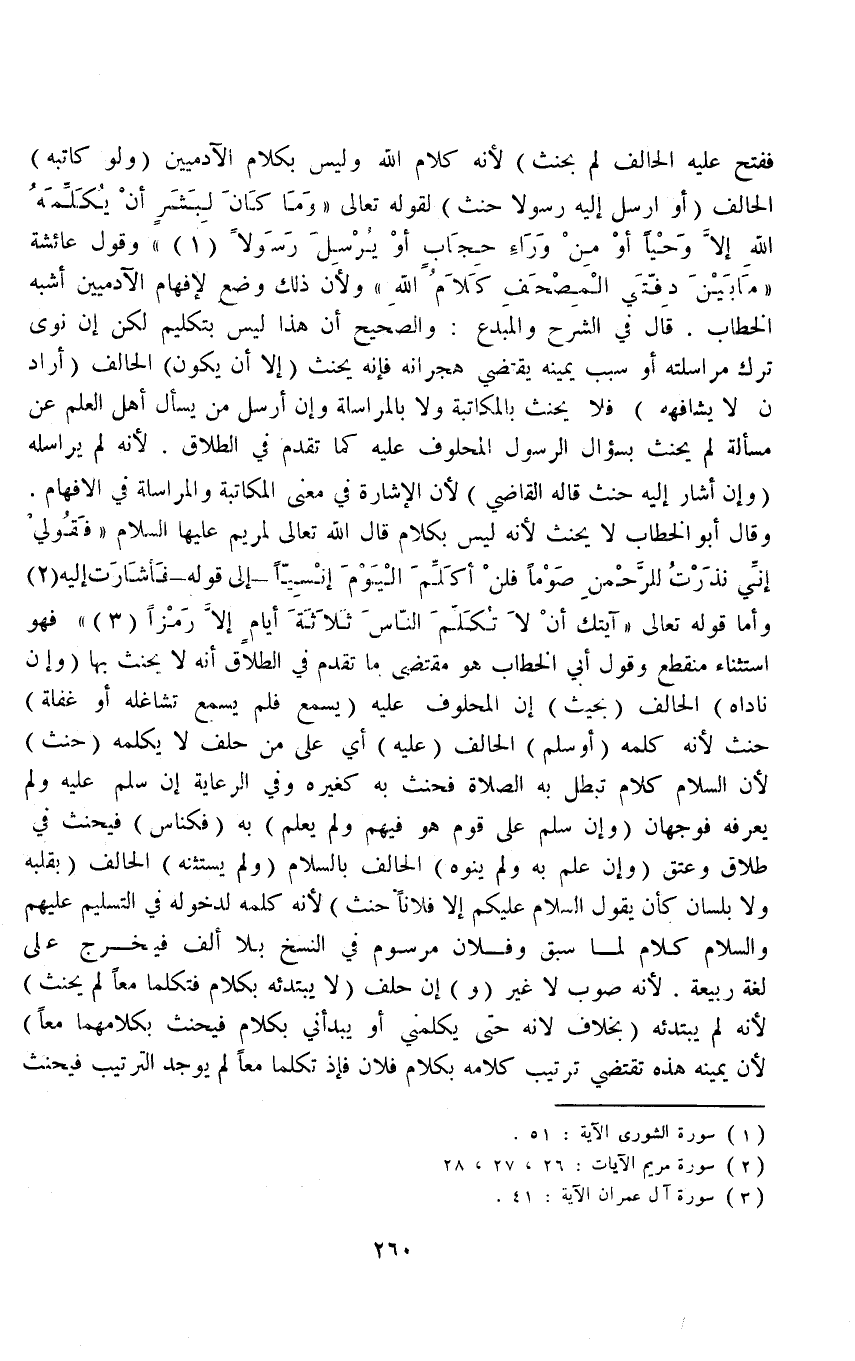 وَأَمَّا قَوْله تَعَالَى {آيَتُكَ أَلا تُكَلِّمَ النَّاسَ ثَلاثَةَ أَيَّامٍ إِلا رَمْزًا} [آل عمران: ٤١] فَهُوَ اسْتِثْنَاءٌ مُنْقَطِعٌ وَقَوْلُ أَبِي الْخَطَّابِ هُوَ مُقْتَضَى مَا تَقَدَّمَ فِي الطَّلَاقِ أَنَّهُ لَا يَحْنَثُ بِهَا (وَإِنْ نَادَاهُ) الْحَالِفُ (بِحَيْثُ) إنَّ الْمَحْلُوفَ عَلَيْهِ (يَسْمَعُ فَلَمْ يَسْمَعْ لِتَشَاغُلِهِ أَوْ غَفْلَةٍ) حَنِثَ لِأَنَّهُ كَلَّمَهُ (أَوْ سَلَّمَ) الْحَالِفُ (عَلَيْهِ) أَيْ عَلَى مَنْ حَلَفَ لَا يُكَلِّمهُ (حَنِثَ) لِأَنَّ السَّلَامَ كَلَامٌ تَبْطُلُ بِهِ الصَّلَاةُ فَحَنِثَ بِهِ كَغَيْرِهِ.