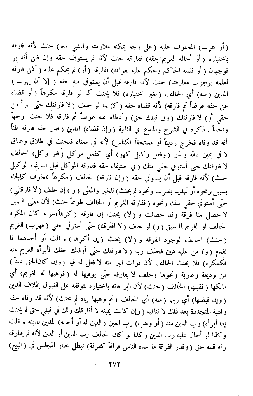 (أَوْ هَرَبَ) الْمَحْلُوفُ عَلَيْهِ (عَلَى وَجْهٍ يُمْكِنهُ مُلَازَمَتُهُ وَالْمَشْي مَعَهُ) حَنِثَ لِأَنَّهُ فَارَقَهُ بِاخْتِيَارِهِ (أَوْ أَحَالَهُ الْغَرِيمُ بِحَقِّهِ) فَفَارَقَهُ حَنِثَ لِأَنَّهُ لَمْ يَسْتَوْفِ حَقَّهُ وَإِنْ ظَنَّ أَنَّهُ بَرَّ فَوَجْهَانِ (أَوْ فَلَّسَهُ الْحَاكِمُ وَحَكَمَ عَلَيْهِ بِفِرَاقِهِ) فَفَارَقَهُ (أَوْ) لَمْ يَحْكُمْ عَلَيْهِ (كَمَنْ فَارَقَهُ لِعِلْمِهِ بِوُجُوبِ مُفَارَقَتِهِ) حَنِثَ لِأَنَّهُ فَارَقَهُ قَبْلَ أَنْ يَسْتَوْفِيَ مِنْهُ حَقَّهُ (إلَّا أَنْ يَهْرُبَ) الْمَدِينُ (مِنْهُ) أَيْ الْحَالِفِ (بِغَيْرِ اخْتِيَارِهِ) فَلَا يَحْنَثُ كَمَا لَوْ فَارَقَهُ مُكْرَهًا (أَوْ قَضَاهُ عَنْ حَقِّهِ عَرْضًا ثُمَّ فَارَقَهُ) لِأَنَّهُ قَضَاهُ حَقَّهُ (كَ) مَا لَوْ حَلَفَ (لَا فَارَقْتُكَ تَبْرَأُ مِنْ حَقِّي أَوْ) لَا فَارَقْتُكَ (وَلِي قِبَلَكَ حَقٌّ) وَأَعْطَاهُ عَنْهُ عِوَضًا ثُمَّ فَارَقَهُ فَلَا حِنْثَ وَجْهًا وَاحِدًا ذَكَرَهُ فِي الشَّرْحِ وَالْمُبْدِعِ فِي الثَّانِيَةِ.