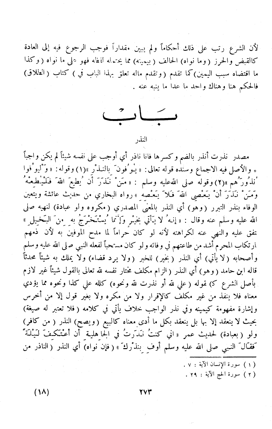 (النَّذْر) مَصْدَرُ نَذَرْتُ أَنْذُرُ بِالضَّمِّ وَكَسْرِهَا فَأَنَا نَاذِرٌ أَيْ أَوْجَبَ عَلَى نَفْسِهِ شَيْئًا لَمْ يَكُنْ وَاجِبًا وَالْأَصْلُ فِيهِ الْإِجْمَاعُ وَسَنَدُهُ قَوْله تَعَالَى: {يُوفُونَ بِالنَّذْرِ} [الإنسان: ٧] وَقَوْله: {وَلْيُوفُوا نُذُورَهُمْ} [الحج: ٢٩] وَقَوْلُهُ - صَلَّى اللَّهُ عَلَيْهِ وَسَلَّمَ -: «مَنْ نَذَرَ أَنْ يُطِيعَ اللَّهَ فَلْيُطِعْهُ وَمَنْ نَذَرَ أَنْ يَعْصِيَ اللَّهَ فَلَا يَعْصِهِ» رَوَاهُ الْبُخَارِيُّ مِنْ حَدِيثِ عَائِشَةَ وَيَتَعَيَّنُ الْوَفَاءُ بِنَذْرِ التَّبَرُّرِ (وَهُوَ) أَيْ النَّذْرُ بِالْمَعْنَى الْمَصْدَرِيِّ (مَكْرُوهُ وَلَوْ عِبَادَةً) لِنَهْيِهِ - صَلَّى اللَّهُ عَلَيْهِ وَسَلَّمَ - عَنْهُ.