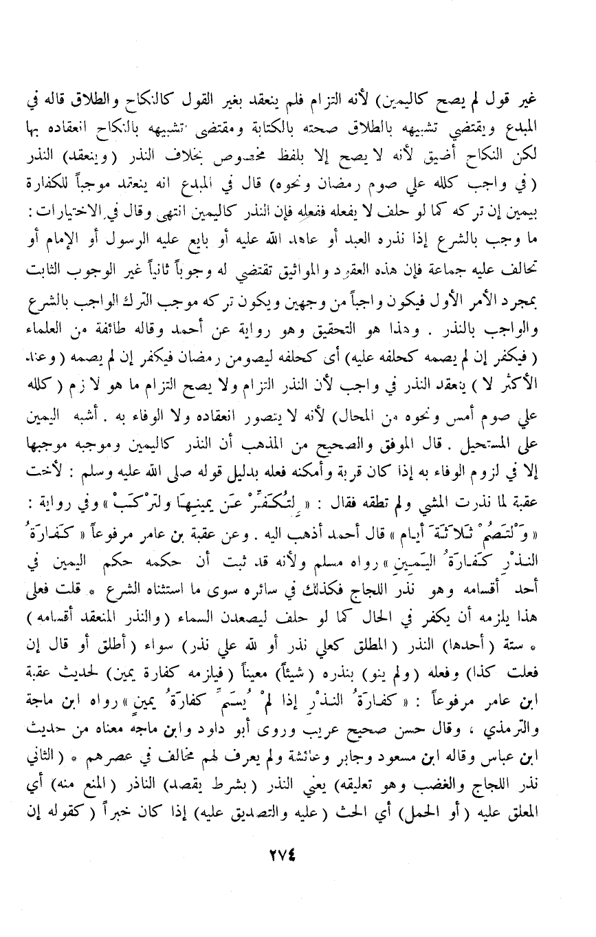 (وَالنَّذْرُ الْمُنْعَقِدُ أَقْسَامُهُ) سِتَّةٌ (أَحَدُهَا) النَّذْرُ (الْمُطْلَقُ كَعَلَيَّ نَذْرٌ أَوْ لِلَّهِ عَلِيَّ نَذْرٌ) سَوَاءٌ (أَطْلَقَ أَوْ قَالَ إنْ فَعَلْتُ كَذَا) وَفَعَلَهُ (وَلَمْ يَنْوِ) بِنَذْرِهِ (شَيْئًا) مُعَيَّنًا (فَيَلْزَمهُ كَفَّارَةُ يَمِينٍ) لِحَدِيثِ عُقْبَةَ بْنِ عَامِرٍ مَرْفُوعًا: «كَفَّارَةُ النَّذْرِ إذَا لَمْ يُسَمَّ كَفَّارَةَ يَمِينٍ» رَوَاهُ ابْنُ مَاجَهْ وَالتِّرْمِذِيُّ وَقَالَ حَسَنٌ صَحِيحٌ غَرِيبٌ.
