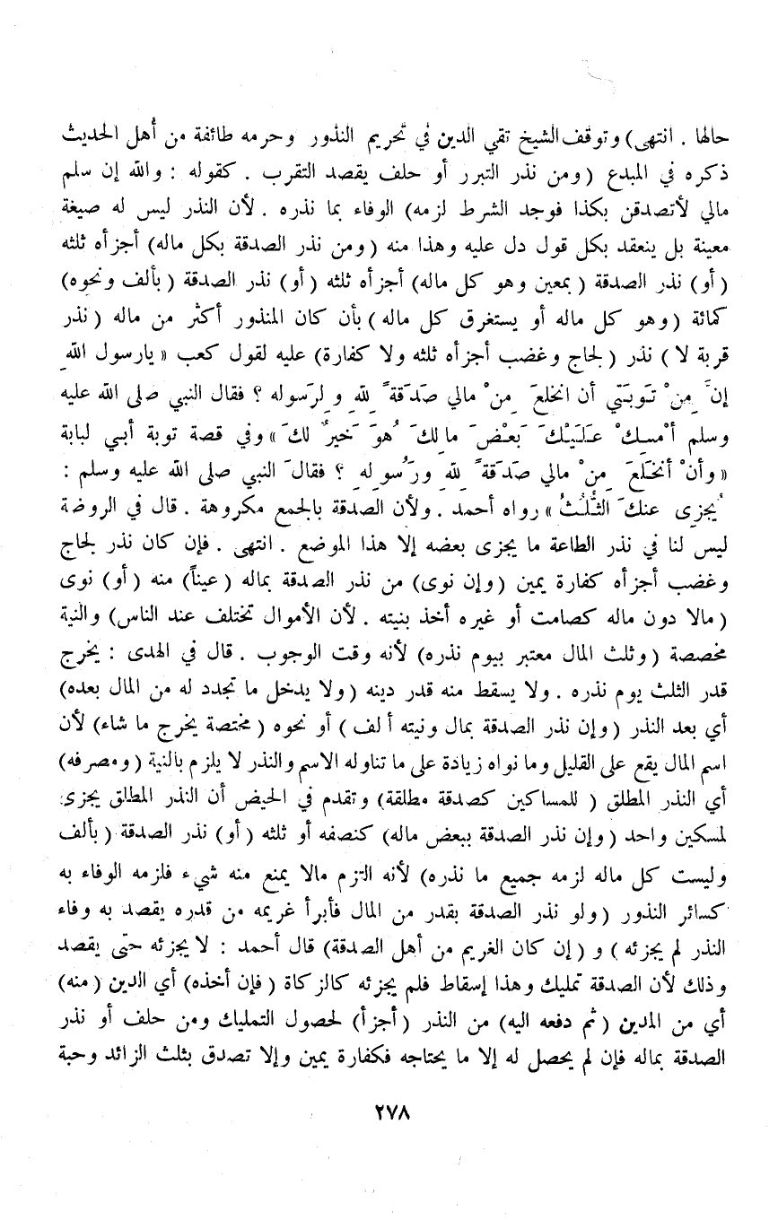 وَتَوَقَّفَ الشَّيْخُ تَقِيُّ الدِّينِ فِي تَحْرِيمِ النُّذُورِ وَحَرَّمَهُ طَائِفَةٌ مِنْ أَهْلِ الْحَدِيثَ ذَكَرَهُ فِي الْمُبْدِعِ.