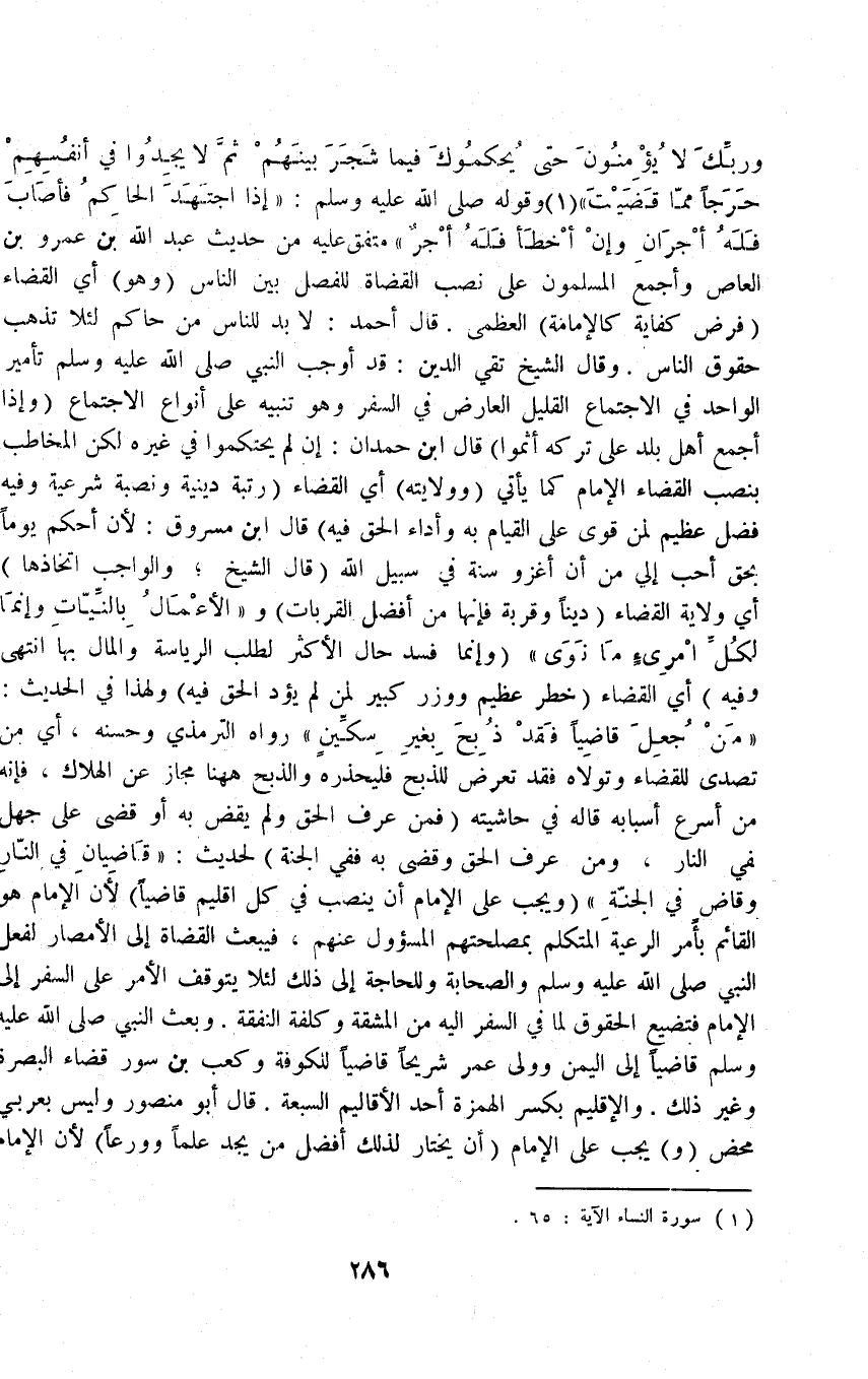 قَالَ أَحْمَدُ: لَا بُدَّ لِلنَّاسِ مِنْ حَاكِمٍ لِئَلَّا تَذْهَبَ حُقُوقُ النَّاسِ وَقَالَ الشَّيْخُ تَقِيُّ الدِّينِ: قَدْ أَوْجَبَ النَّبِيُّ - صَلَّى اللَّهُ عَلَيْهِ وَسَلَّمَ - تَأْمِيرَ الْوَاحِدِ فِي الِاجْتِمَاعِ الْقَلِيلِ الْعَارِضِ فِي السَّفَرِ، وَهُوَ تَنْبِيهٌ عَلَى أَنْوَاعِ الِاجْتِمَاعِ (وَإِذَا أَجْمَعَ أَهْلُ بَلَدٍ عَلَى تَرْكِهِ أَثِمُوا) قَالَ ابْنُ حَمْدَانَ: إنْ لَمْ يَحْكُمُوا فِي غَيْرِهِ لَكِنْ الْمُخَاطَبُ بِنَصْبِ الْقَضَاءِ الْإِمَامُ كَمَا يَأْتِي (وَوِلَايَتُهُ) أَيْ الْقَضَاءِ (رُتْبَةٌ دِينِيَّةٌ وَنَصْبُهُ شَرْعِيَّةٌ وَفِيهِ فَضْلٌ عَظِيمٌ لِمَنْ قَوِيَ عَلَى الْقِيَامِ بِهِ وَأَدَاءِ الْحَقِّ فِيهِ) قَالَ ابْنُ مَسْرُوقٍ: لَأَنْ أَحْكُمَ يَوْمًا بِحَقٍّ أَحَبُّ إلَيَّ مِنْ أَنْ أَغْزُو سَنَةً فِي سَبِيلِ اللَّهِ.