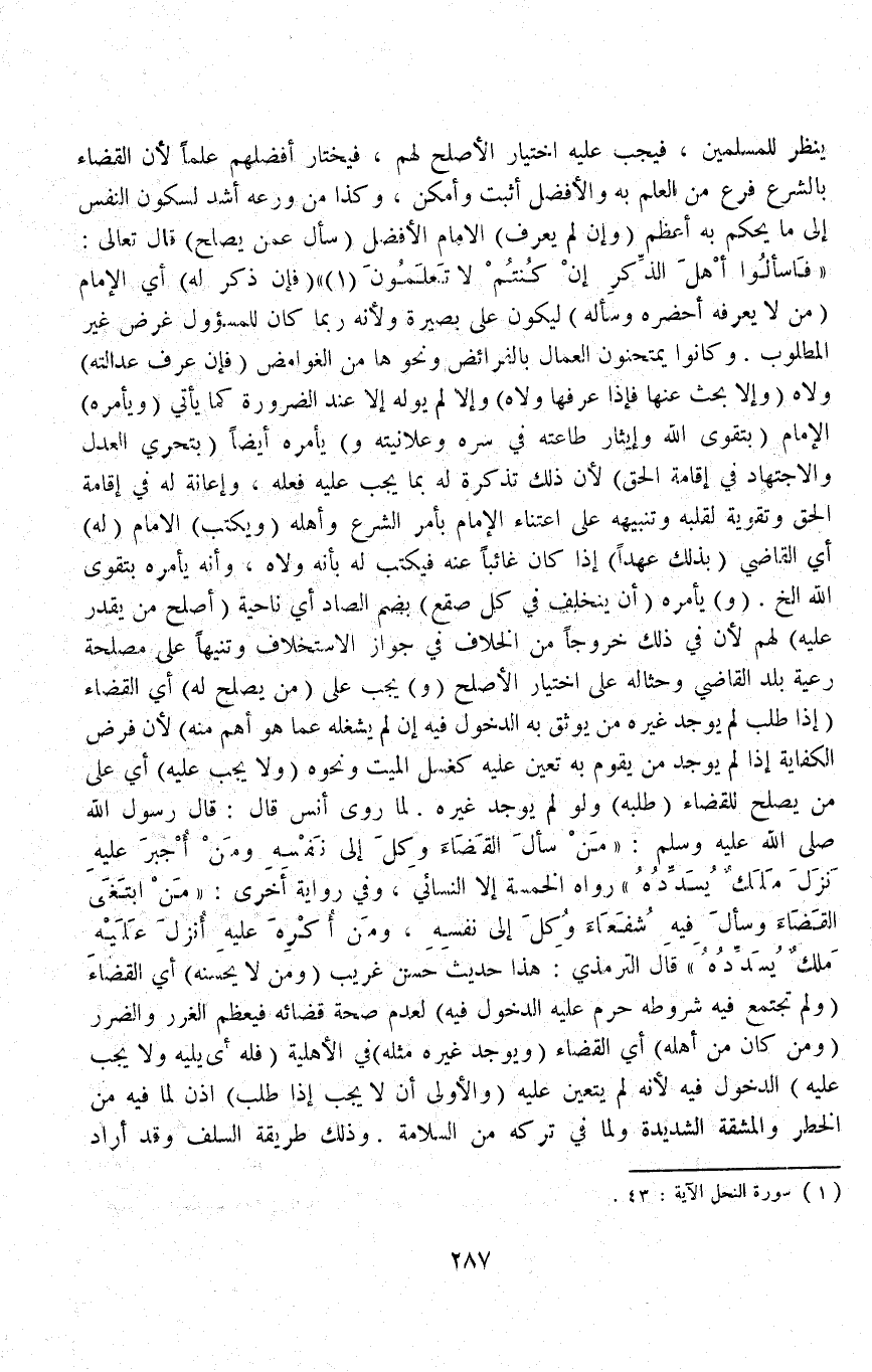 ، (وَ) يَجِبُ عَلَى (مَنْ يَصْلُحُ لَهُ) أَيْ الْقَضَاءِ (إذَا طُلِبَ لَمْ يُوجَدْ غَيْرُهُ مِمَّنْ يُوثَقُ بِهِ الدُّخُولُ فِيهِ إنْ لَمْ يَشْغَلْهُ عَمَّا هُوَ أَهَمُّ مِنْهُ) لِأَنَّ فَرْضَ الْكِفَايَةِ إذَا لَمْ يُوجَدْ مَنْ يَقُومُ بِهِ تَعَيَّنَ عَلَيْهِ كَغُسْلِ الْمَيِّتِ وَنَحْوِهِ (وَلَا يَجِبُ عَلَيْهِ) أَيْ عَلَى مَنْ يَصْلُحُ لِلْقَضَاءِ (طَلَبُهُ) وَلَوْ لَمْ يُوجَدْ غَيْرُهُ لِمَا رَوَى أَنَسٌ قَالَ: قَالَ رَسُولُ اللَّهِ - صَلَّى اللَّهُ عَلَيْهِ وَسَلَّمَ -: «مَنْ سَأَلَ الْقَضَاءَ وُكِلَ إلَى نَفْسِهِ وَمَنْ أُجْبِرَ عَلَيْهِ نَزَلَ مَلَكٌ يُسَدِّدُهُ» رَوَاهُ الْخَمْسَةُ إلَّا النَّسَائِيَّ.