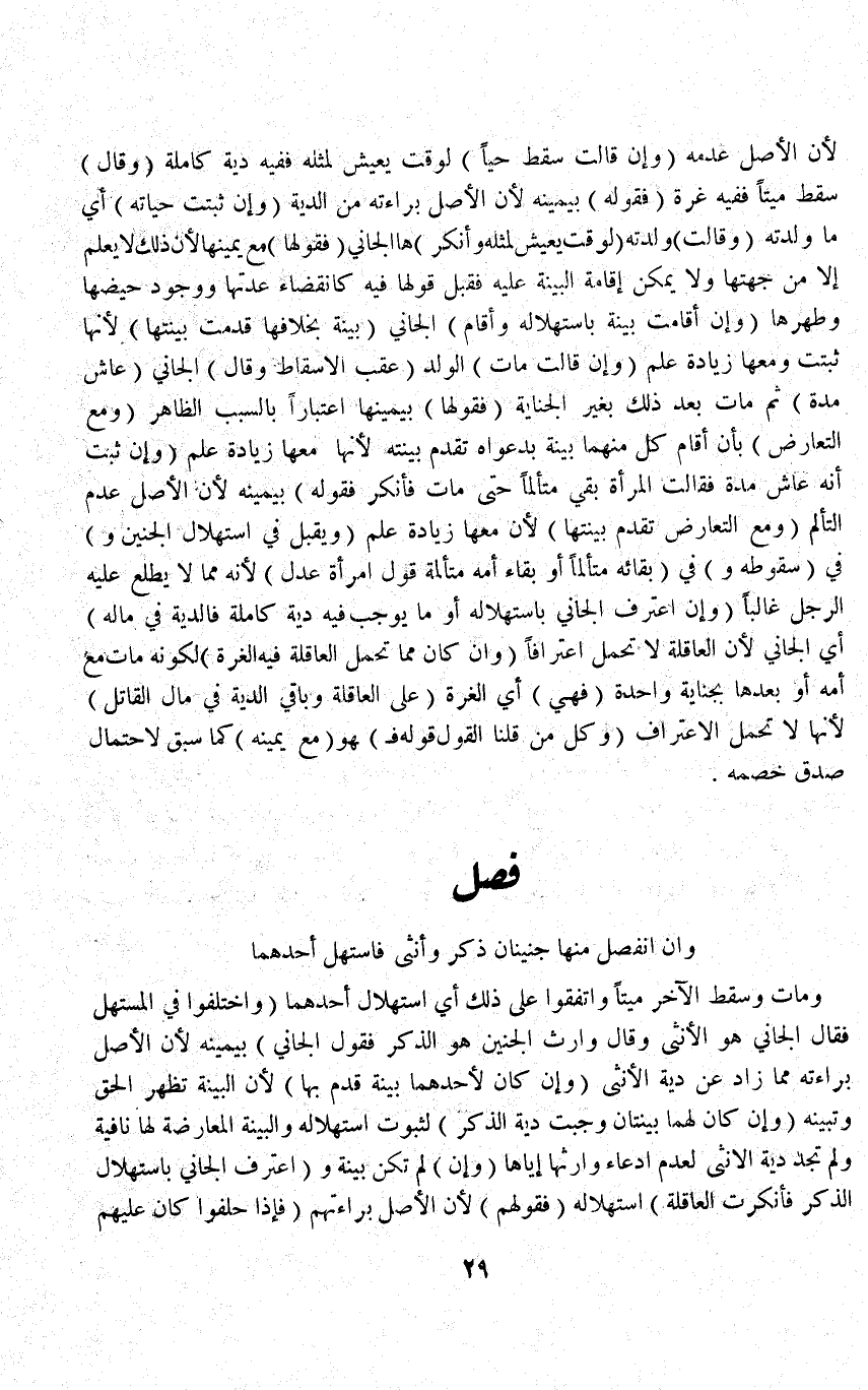 (فَصْل وَإِنْ انْفَصَلَ مِنْهَا جَنِينَانِ ذَكَرٌ وَأُنْثَى فَاسْتَهَلَّ أَحَدُهُمَا وَمَاتَ وَسَقَطَ الْآخَرُ مَيِّتًا وَاتَّفَقُوا عَلَى ذَلِكَ) أَيْ اسْتِهْلَالِ أَحَدِهِمَا (وَاخْتَلَفُوا فِي الْمُسْتَهَلِّ فَقَالَ الْجَانِي هُوَ الْأُنْثَى وَقَالَ وَارِثُ الْجَنِينِ هُوَ الذَّكَرُ فَقَوْلُ الْجَانِي) بِيَمِينِهِ لِأَنَّ الْأَصْلَ بَرَاءَتُهُ مِمَّا زَادَ عَنْ دِيَةِ الْأُنْثَى (وَإِنْ كَانَ لِأَحَدِهِمَا بَيِّنَةٌ قَدِمَ بِهَا) لِأَنَّ الْبَيِّنَةَ تُظْهِرُ الْحَقَّ وَتُبَيِّنُهُ (وَإِنْ كَانَ لَهُمَا بَيِّنَتَانِ وَجَبَتْ دِيَةُ الذَّكَرِ) لِثُبُوتِ اسْتِهْلَالِهِ وَالْبَيِّنَةُ الْمُعَارِضَةُ لَهَا نَافِيَةٌ وَلَمْ تَجِبْ دِيَةُ الْأُنْثَى لِعَدَمِ ادِّعَاءِ وَارِثِهَا إيَّاهَا (وَإِنْ) لَمْ تَكُنْ بَيِّنَةٌ وَ (اعْتَرَفَ الْجَانِي بِاسْتِهْلَالِ الذَّكَرِ فَأَنْكَرَتْ الْعَاقِلَةُ) اسْتِهْلَالَهُ (فَقَوْلُهُمْ) لِأَنَّ الْأَصْلَ بَرَاءَتُهُمْ (فَإِذَا حَلَفُوا كَانَ عَلَيْهِمْ