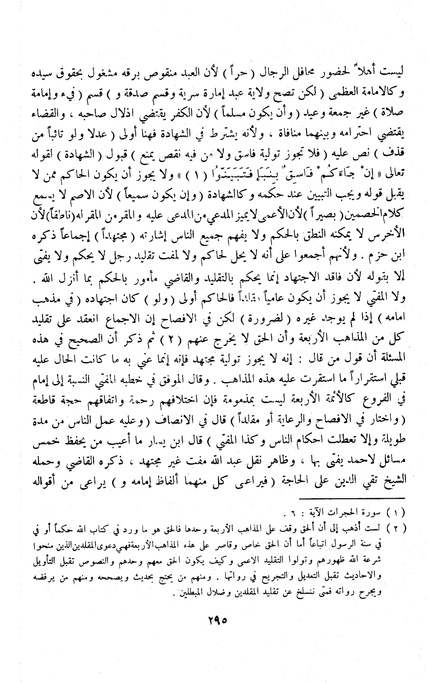 (فَلَا تَجُوزُ تَوْلِيَةُ فَاسِقٍ وَلَا مَنْ فِيهِ نَقْصٌ يَمْنَعُ) قَبُولَ (الشَّهَادَةِ) لِقَوْلِهِ تَعَالَى {إِنْ جَاءَكُمْ فَاسِقٌ بِنَبَإٍ فَتَبَيَّنُوا ا} [الحجرات: ٦] وَلَا يَجُوزُ أَنْ يَكُونَ الْحَاكِمُ مِمَّنْ لَا يُقْبَلُ قَوْلُهُ وَيَجِبُ التَّبْيِينُ عِنْدَ حُكْمِهِ وَكَالشَّهَادَةِ (وَأَنْ يَكُونَ سَمِيعًا) لِأَنَّ الْأَصَمَّ لَا يَسْمَعُ كَلَامَ الْخَصْمَيْنِ (بَصِيرًا) لِأَنَّ الْأَعْمَى لَا يُمَيِّز الْمُدَّعِي مِنْ الْمُدَّعَى عَلَيْهِ وَالْمُقِرَّ مَنْ الْمُقَرِّ لَهُ (نَاطِقًا) لِأَنَّ الْأَخْرَسَ لَا يُمْكِنُهُ النُّطْقُ بِالْحُكْمِ، وَلَا يَفْهَمُ جَمِيعُ النَّاسِ إشَارَتَهُ (مُجْتَهِدًا) إجْمَاعًا ذَكَرَهُ ابْنُ حَزْمٍ وَلِأَنَّهُمْ أَجْمَعُوا عَلَى أَنَّهُ لَا يَحِلّ لِحَاكِمٍ وَلَا لِمُفْتٍ تَقْلِيدُ رَجُلٍ لَا يَحْكُمُ وَلَا يُفْتِي إلَّا بِقَوْلِهِ؛ لِأَنَّ فَاقِدَ الِاجْتِهَادِ إنَّمَا يَحْكُمُ بِالتَّقْلِيدِ وَالْقَاضِي مَأْمُورٌ بِالْحُكْمِ بِمَا أَنْزَلَ اللَّهُ وَلَا الْمُفْتِي لَا يَجُوزُ أَنْ يَكُونَ عَامِّيًّا مُقَلِّدًا فَالْحَاكِمُ أَوْلَى.
