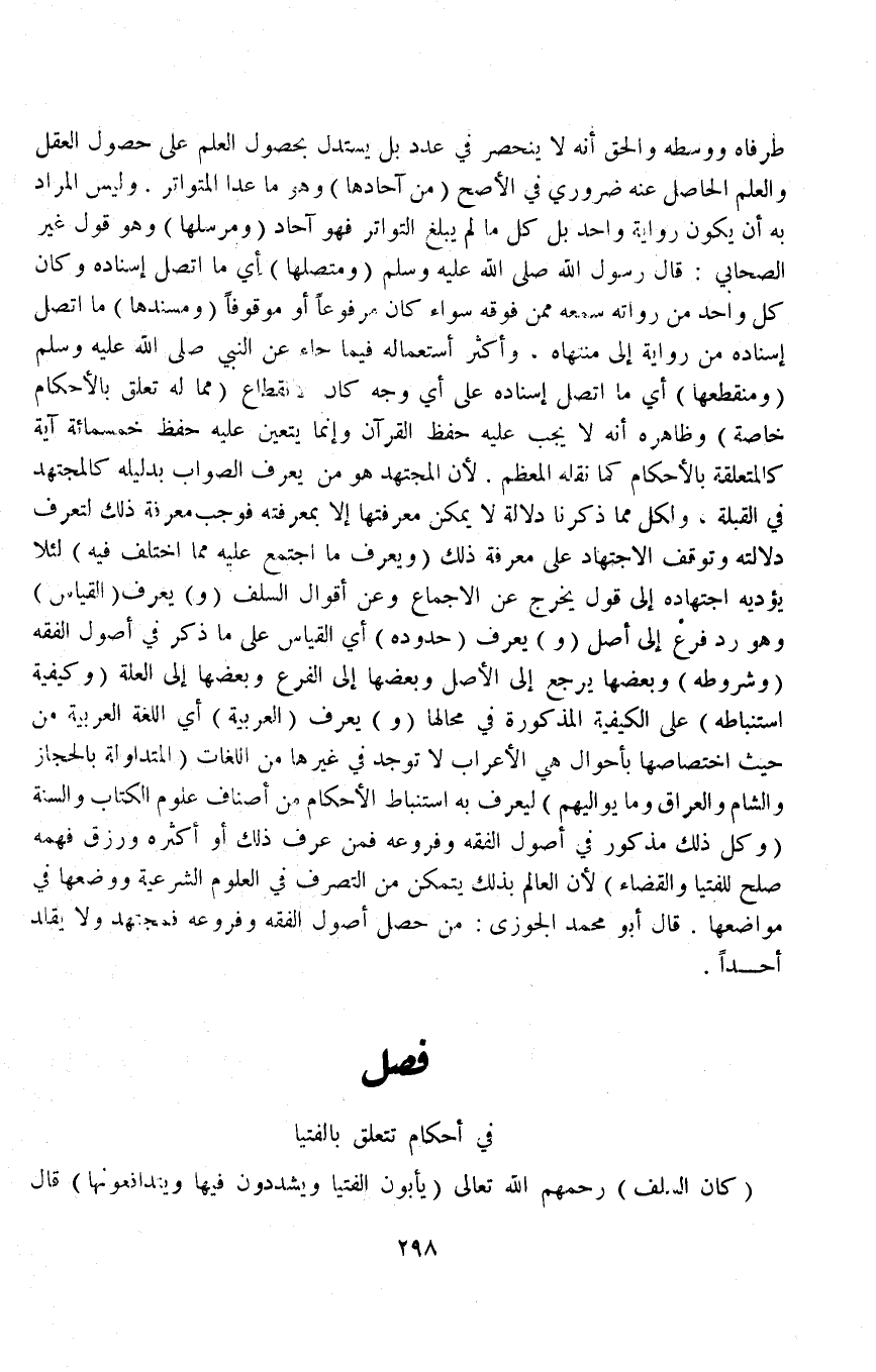 (وَ) يَعْرِفُ (الْعَرَبِيَّةَ) أَيْ اللُّغَةَ الْعَرَبِيَّةَ مِنْ حَيْثُ اخْتِصَاصُهَا بِأَحْوَالٍ هِيَ: الْإِعْرَابُ لَا تُوجَدُ فِي غَيْرِهَا مِنْ اللُّغَاتِ (الْمُتَدَاوَلَةَ بِالْحِجَازِ وَالشَّامِ وَالْعِرَاقِ وَمَا يُوَالِيهِمْ) لِيَعْرِفَ بِهِ اسْتِنْبَاطَ الْأَحْكَامِ مِنْ أَصْنَافِ عُلُومِ الْكِتَابِ وَالسُّنَّةِ (وَكُلُّ ذَلِكَ مَذْكُورٌ فِي أُصُولِ الْفِقْهِ وَفُرُوعِهِ فَمَنْ عَرَفَ ذَلِكَ أَوْ أَكْثَرَهُ وَرُزِقَ فَهْمَهُ صَلُحَ لِلْفُتْيَا وَالْقَضَاءِ) لِأَنَّ الْعَالِمَ بِذَلِكَ يَتَمَكَّنُ مِنْ التَّصَرُّفِ فِي الْعُلُومِ الشَّرْعِيَّةِ وَوَضْعِهَا فِي مَوَاضِعِهَا قَالَ أَبُو مُحَمَّدٍ الْجَوْزِيُّ: مَنْ حَصَّلَ أُصُولَ الْفِقْهِ وَفُرُوعَهُ فَمُجْتَهِدٌ وَلَا يُقَلِّدُ أَحَدًا.