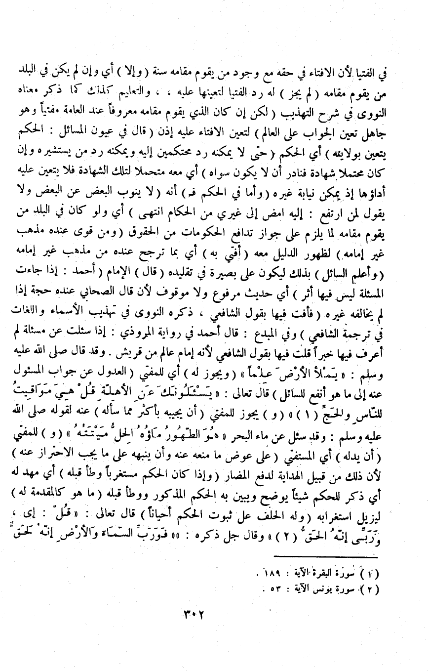 فِي الْفُتْيَا لِأَنَّ الْإِفْتَاءَ فِي حَقِّهِ مَعَ وُجُودِ مَنْ يَقُومُ مَقَامَهُ سَنَةً (وَإِلَّا) أَيْ وَإِنْ لَمْ يَكُنْ فِي الْبَلَدِ مَنْ يَقُومُ مَقَامَهُ (لَمْ يَجُزْ) لَهُ رَدُّ الْفُتْيَا لِتَعَيُّنِهَا عَلَيْهِ، وَالتَّعْلِيمُ كَذَلِكَ كَمَا ذَكَرَ مَعْنَاهُ النَّوَوِيُّ فِي شَرْحِ التَّهْذِيبِ (لَكِنْ إنْ كَانَ الَّذِي يَقُومُ مَقَامَهُ مَعْرُوفًا عِنْدَ الْعَامَّةِ مُفْتِيًا وَهُوَ جَاهِلٌ تَعَيَّنَ الْجَوَابُ عَلَى الْعَالِمِ) لِتَعَيُّنِ الْإِفْتَاءِ عَلَيْهِ إذَنْ (قَالَ فِي عُيُونِ الْمَسَائِلِ: الْحُكْمُ يَتَعَيَّنُ بِوِلَايَتِهِ) أَيْ الْحُكْمِ (حَتَّى لَا يُمْكِنَهُ رَدُّ مُحْتَكِمَيْنِ إلَيْهِ وَيُمْكِنُهُ رَدُّ مَنْ يَسْتَشِيرُهُ وَإِنْ كَانَ مُحْتَمِلًا شَهَادَةً فَنَادِرٌ أَنْ لَا يَكُونَ سِوَاهُ) أَيْ مَعَهُ مُتَحَمِّلًا لِتِلْكَ الشَّهَادَةِ فَلَا يَتَعَيَّنُ عَلَيْهِ أَدَاؤُهَا إذْ يُمْكِنُ نِيَابَةُ غَيْرِهِ (وَأَمَّا فِي الْحُكْمِ فَ) إنَّهُ (لَا يَنُوبُ الْبَعْض عَنْ الْبَعْضِ وَلَا يَقُولُ لِمَنْ ارْتَفَعَ: إلَيْهِ امْضِ إلَى غَيْرِي مِنْ الْحُكَّامِ انْتَهَى) أَيْ وَلَوْ كَانَ فِي الْبَلَدِ مَنْ يَقُومُ مَقَامَهُ لَمَا يَلْزَمُ عَلَى جَوَازِ تَدَافُعِ الْحُكُومَاتِ مِنْ الْحُقُوقِ.
