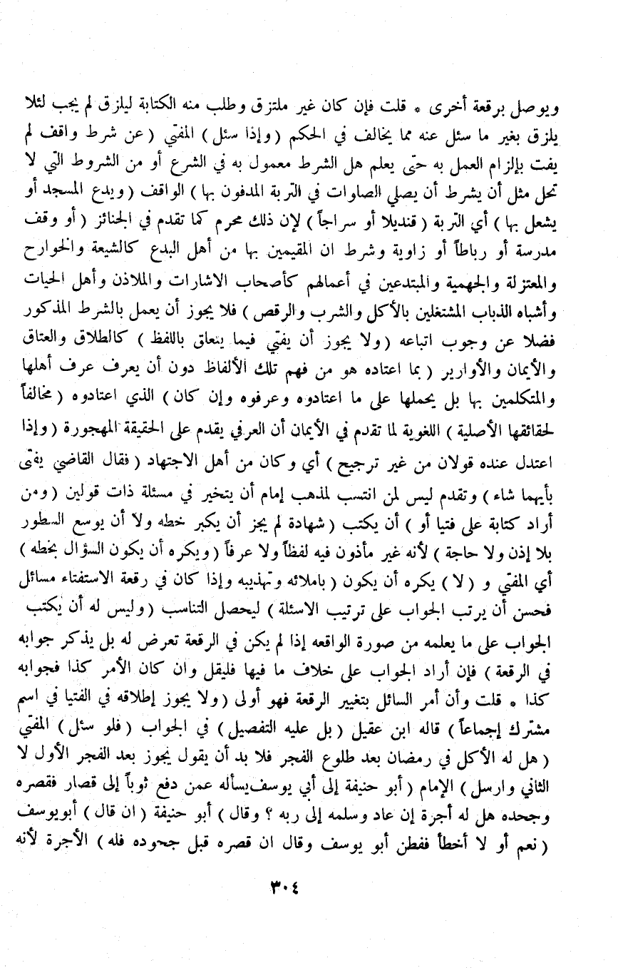 (وَإِذَا سُئِلَ) الْمُفْتِي (عَنْ شَرْطٍ وَاقِفٍ لَمْ يُفْتِ بِإِلْزَامِ الْعَمَلِ بِهِ حَتَّى يَعْلَمَ هَلْ الشَّرْطُ مَعْمُولٌ بِهِ فِي الشَّرْعِ أَوْ مِنْ الشُّرُوطِ الَّتِي لَا تَحِلُّ مِثْلُ أَنْ يَشْرِطَ أَنْ يُصَلِّيَ الصَّلَوَاتِ فِي التُّرْبَةِ الْمَدْفُونِ بِهَا) الْوَاقِفُ (وَيَدْعُ الْمَسْجِدَ أَوْ يُشْعِلَ بِهَا) أَيْ التُّرْبَةِ (قِنْدِيلًا أَوْ سِرَاجًا) لِأَنَّ ذَلِكَ مُحَرَّمٌ كَمَا تَقَدَّمَ فِي الْجَنَائِزِ (أَوْ وَقَفَ مَدْرَسَةً أَوْ رِبَاطًا أَوْ زَاوِيَةً وَشَرَطَ أَنَّ الْمُقِيمِينَ بِهَا مِنْ أَهْلِ الْبِدَعِ كَالشِّيعَةِ وَالْخَوَارِجِ وَالْمُعْتَزِلَةِ وَالْجَهْمِيَّةِ وَالْمُبْتَدِعِينَ فِي أَعْمَالِهِمْ، كَأَصْحَابِ الْإِشَارَاتِ وَالْمَلَاذِنِ وَأَهْلِ الْحَيَّاتِ وَأَشْبَاهِ الذُّبَابِ الْمُشْتَغِلِينَ بِالْأَكْلِ وَالشُّرْبِ وَالرَّقْصِ) فَلَا يَجُوزُ أَنْ يُعْمَلَ بِالشَّرْطِ الْمَذْكُورِ فَضْلًا عَنْ وُجُوبِ اتِّبَاعِهِ (وَلَا يَجُوزُ أَنْ يُفْتِيَ فِيمَا يَتَعَلَّقُ بِاللَّفْظِ) كَالطَّلَاقِ وَالْعَتَاقِ وَالْأَيْمَانِ وَالْأَقَارِيرِ (بِمَا اعْتَادَهُ هُوَ مِنْ فَهْمِ تِلْكَ الْأَلْفَاظِ دُونَ أَنْ يَعْرِفَ عُرْفَ أَهْلِهَا وَالْمُتَكَلِّمِينَ بِهَا بَلْ يَحْمِلُهَا عَلَى مَا اعْتَادُوهُ وَعَرَفُوهُ وَإِنْ كَانَ) الَّذِي اعْتَادُوهُ (مُخَالِفًا لِحَقَائِقِهَا الْأَصْلِيَّةِ) اللُّغَوِيَّةِ لِمَا تَقَدَّمَ فِي الْأَيْمَانِ أَنَّ الْعُرْفَ يُقَدَّمُ عَلَى الْحَقِيقَةِ الْمَهْجُورَةِ.