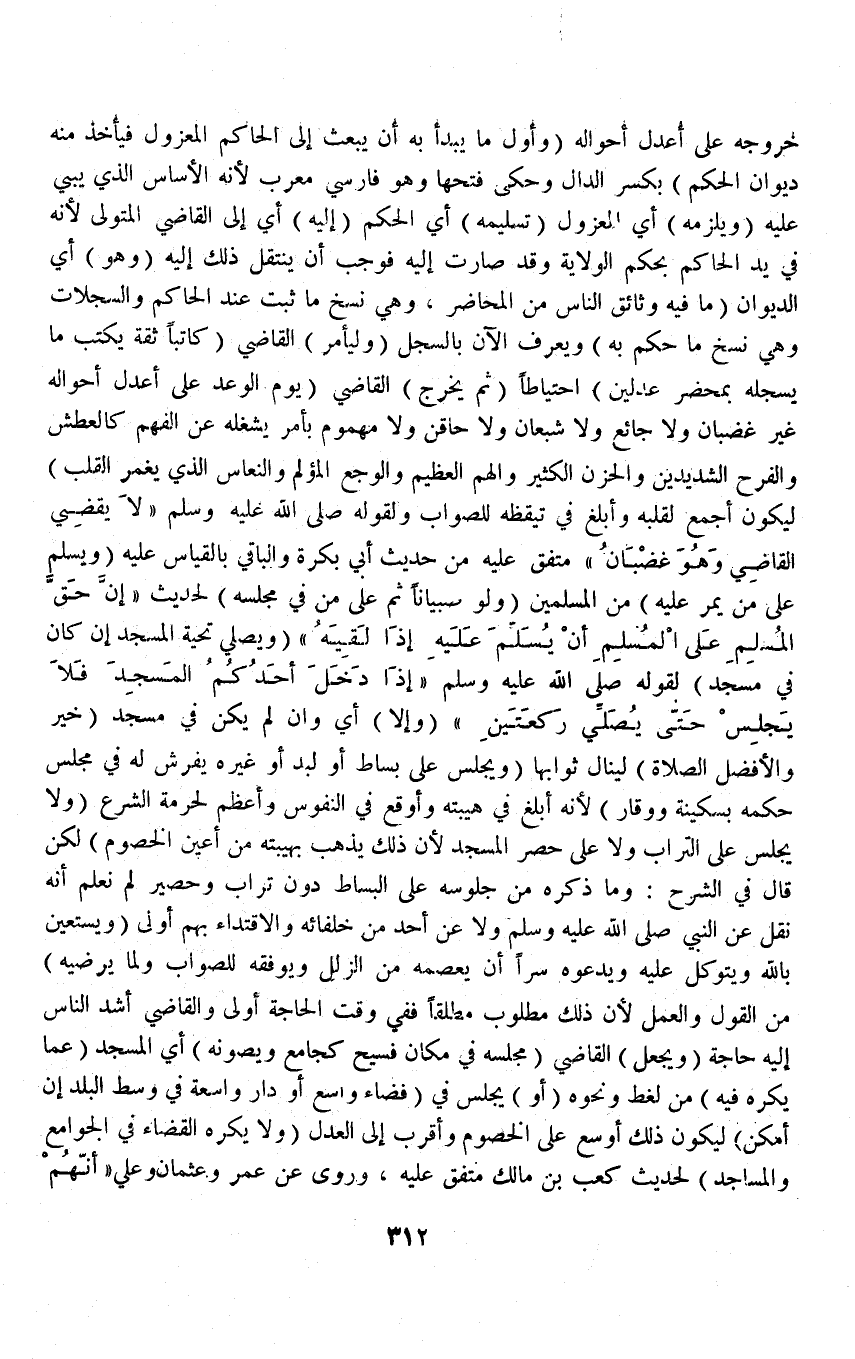 (وَلِيَأْمُرَ) الْقَاضِي (كَاتِبًا ثِقَةً يَكْتُبُ مَا يُسَجِّلُهُ بِمَحْضَرِ عَدْلَيْنِ) احْتِيَاطًا (ثُمَّ يَخْرُجُ) الْقَاضِي (يَوْمَ الْوَعْدِ عَلَى أَعْدَلِ أَحْوَالِهِ غَيْرَ غَضْبَانَ وَلَا جَائِعٍ وَلَا شَبْعَانَ وَلَا حَاقِنٍ وَلَا مَهْمُومٍ بِأَمْرٍ يَشْغَلُهُ عَنْ الْفَهْمِ كَالْعَطَشِ وَالْفَرَحِ الشَّدِيدَيْنِ وَالْحُزْنِ الْكَثِيرِ وَالْهَمِّ الْعَظِيمِ وَالْوَجَعِ الْمُؤْلِمِ وَالنُّعَاسِ الَّذِي يَغْمُرُ الْقَلْبَ) لِيَكُونَ أَجْمَعَ لِقَلْبِهِ وَأَبْلَغَ فِي تَيَقُّظِهِ لِلصَّوَابِ وَلِقَوْلِهِ - صَلَّى اللَّهُ عَلَيْهِ وَسَلَّمَ - «لَا يَقْضِي الْقَاضِي وَهُوَ غَضْبَانُ» مُتَّفَقٌ عَلَيْهِ مِنْ حَدِيثِ أَبِي بَكْرَةَ وَالْبَاقِي بِالْقِيَاسِ عَلَيْهِ.