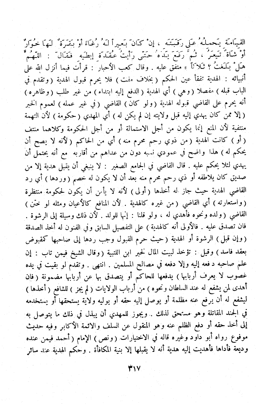 الْقِيَامَةِ يَحْمِلُهُ عَلَى رَقَبَتِهِ، إنْ كَانَ بَعِيرًا لَهُ رُغَاءٌ أَوْ بَقَرَةٌ لَهَا خُوَارٌ أَوْ شَاةٌ تَيْعَرُ، ثُمَّ رَفَعَ يَدَهُ حَتَّى رُئِيَتْ عُقْدَةُ إبِطَيْهِ فَقَالَ: اللَّهُمَّ هَلْ بَلَّغْتُ؟ ثَلَاثًا» مُتَّفَقٌ عَلَيْهِ.