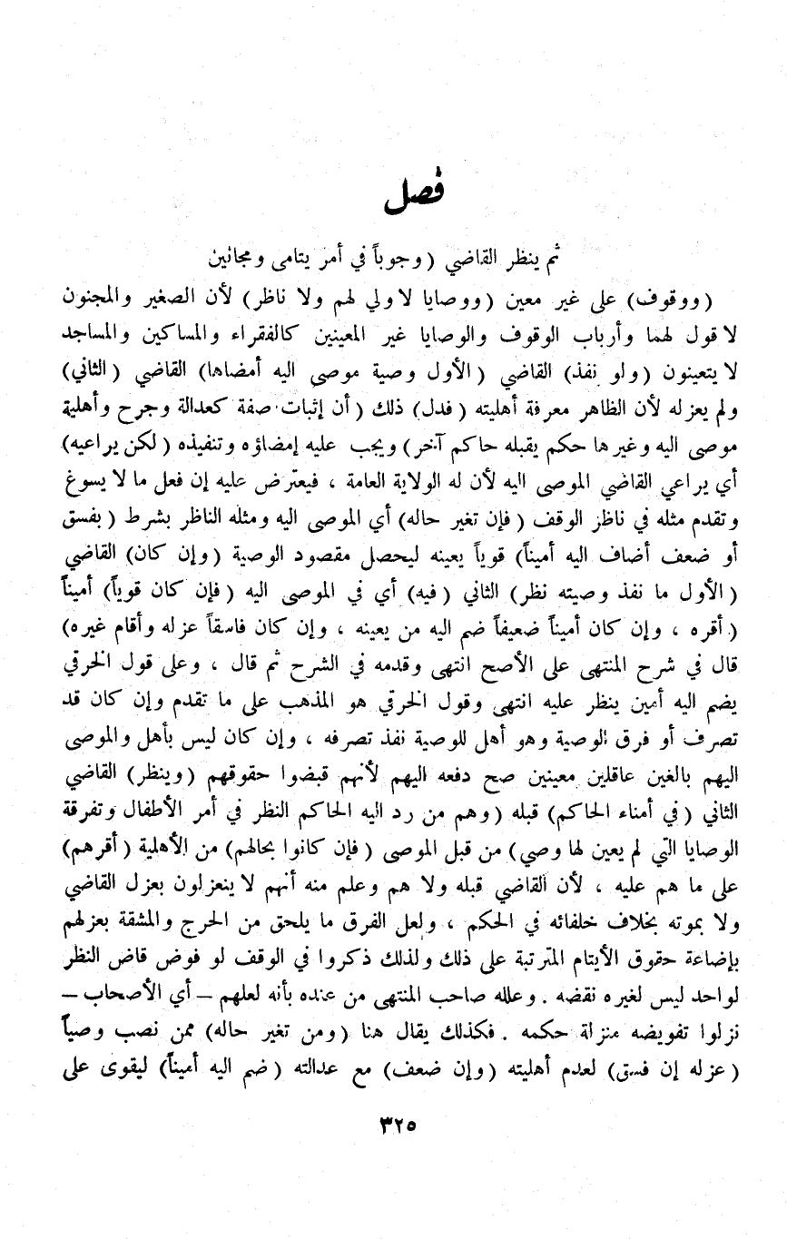 (فَصْلٌ ثُمَّ يَنْظُرُ) الْقَاضِي (وُجُوبًا فِي أَمْرِ يَتَامَى وَمَجَانِينَ وَوُقُوفٍ) عَلَى غَيْرِ مُعَيَّنٍ (وَوَصَايَا لَا وَلِيَّ لَهُمْ وَلَا نَاظِرَ) لِأَنَّ الصَّغِيرَ وَالْمَجْنُونَ لَا قَوْلَ لَهُمَا وَأَرْبَابُ الْوُقُوفِ وَالْوَصَايَا غَيْرُ الْمُعَيَّنِينَ كَالْفُقَرَاءِ وَالْمَسَاكِينِ وَالْمَسَاجِدِ لَا يَتَعَيَّنُونَ.