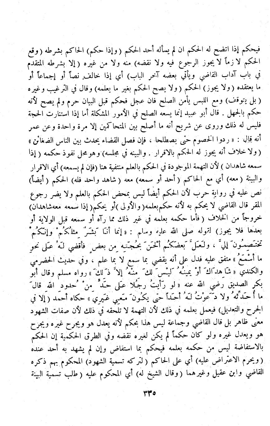 وَفِي حَدِيثِ الْحَضْرَمِيِّ وَالْكِنْدِيِّ «شَاهِدَاكَ أَوْ يَمِينُهُ لَيْسَ لَكَ مِنْهُ إلَّا ذَلِكَ» رَوَاهُ مُسْلِمٌ وَقَالَ أَبُو بَكْرٍ الصِّدِّيقُ - رَضِيَ اللَّهُ عَنْهُ - " لَوْ رَأَيْتُ رَجُلًا عَلَى حَدٍّ مِنْ حُدُودِ اللَّهِ قَالَ مَا أُحَدِّثُهُ وَلَا دَعَوْتُ لَهُ أَحَدًا حَتَّى يَكُونَ مَعِي غَيْرِي " حَكَاهُ أَحْمَدُ (إلَّا فِي الْجَرْحِ وَالتَّعْدِيلِ) فَيَعْمَلُ بِعِلْمِهِ فِي ذَلِكَ لِأَنَّ التُّهْمَةَ لَا تَلْحَقُهُ فِي ذَلِكَ لِأَنَّ صِفَاتِ الشُّهُودِ مَعْنًى ظَاهِرٌ بَلْ قَالَ الْقَاضِي وَجَمَاعَةٌ: لَيْسَ هَذَا بِحُكْمٍ لِأَنَّهُ يُعَدِّلُ هُوَ وَيَجْرَحُ غَيْرَهُ وَيَجْرَحُ هُوَ وَيُعَدِّلُ غَيْرَهُ وَلَوْ كَانَ حُكْمًا لَمْ يَكُنْ لِغَيْرِهِ نَقْضُهُ.