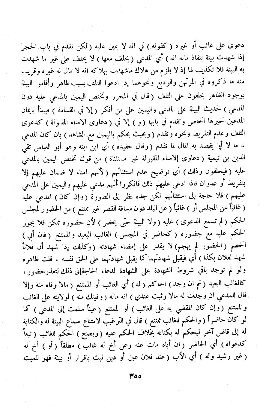 (وَ) إلَّا فِي (دَعَاوَى الْأُمَنَاءِ الْمَقْبُولَةِ) كَدَعْوَى التَّلَفِ وَعَدَمِ التَّفْرِيطِ وَنَحْوِهِ وَتَقَدَّمَ (وَبِحَيْثُ يَحْكُمُ بِالْيَمِينِ مَعَ الشَّاهِدِ) بِأَنْ كَانَ الْمُدَّعِي بِهِ مَالًا أَوْ يَقْصِدُ بِهِ الْمَالَ لِمَا تَقَدَّمَ (وَقَالَ حَفِيدُهُ) أَيْ ابْنُ ابْنِهِ وَهُوَ أَبُو الْعَبَّاسِ تَقِيُّ الدِّين بْنُ تَيْمِيَّةَ (دَعَاوَى الْأُمَنَاءِ الْمَقْبُولَةُ غَيْرُ مُسْتَثْنَاةٍ) مِنْ قَوْلِنَا تَخْتَصُّ الْيَمِينُ بِالْمُدَّعَى عَلَيْهِ (فَيَحْلِفُونَ وَذَلِكَ) أَيْ تَوْضِيحُ عَدَمِ اسْتِثْنَائِهِمْ (لِأَنَّهُمْ أُمَنَاءُ لَا ضَمَانَ عَلَيْهِمْ إلَّا بِتَفْرِيطٍ أَوْ عُدْوَانٍ فَإِذَا ادَّعَى عَلَيْهِمْ ذَلِكَ فَأَنْكَرُوا أَنَّهُمْ مُدَّعَى عَلَيْهِمْ وَالْيَمِينُ عَلَى الْمُدَّعَى عَلَيْهِمْ) فَلَا حَاجَةَ إلَى اسْتِثْنَائِهِمْ لَكِنَّ جَدَّهُ نَظَرَ إلَى الصُّورَةِ.