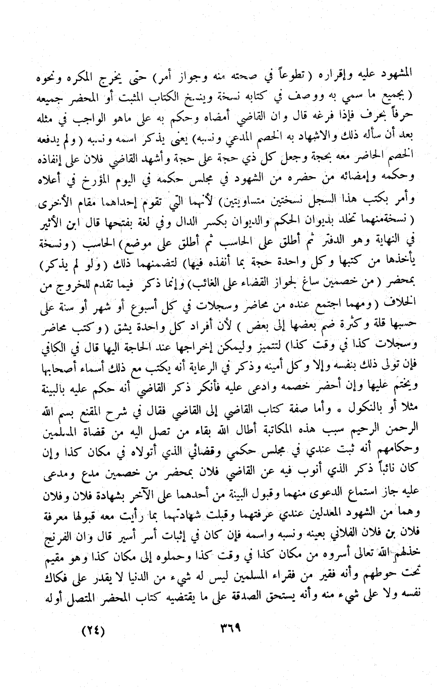 الْمَشْهُودَ عَلَيْهِ وَإِقْرَارَهُ (تَطَوُّعًا فِي صِحَّتِهِ مِنْهُ وَجَوَازِ أَمْرٍ) حَتَّى يَخْرُجَ الْمُكْرَهُ وَنَحْوُهُ (بِجَمِيعِ مَا سُمِّيَ بِهِ وَوَصْف فِي كِتَابِهِ نُسْخَةً وَيَنْسَخُ الْكِتَابَ الْمُثْبَتَ أَوْ الْمُحْضَرَ جَمِيعَهُ حَرْفًا بِحَرْفٍ فَإِذَا فَرَغَهُ قَالَ وَإِنَّ الْقَاضِيَ أَمْضَاهُ وَحَكَمَ بِهِ عَلَى مَا هُوَ الْوَاجِبُ فِي مِثْلِهِ بَعْدَ أَنْ سَأَلَهُ ذَلِكَ وَالْإِشْهَادَ بِهِ الْخَصْمُ الْمُدَّعِي وَنَسَبُهُ) يَعْنِي يَذْكُرُ اسْمَهُ وَنَسَبَهُ (وَلَمْ يَدْفَعْهُ الْخَصْمُ الْحَاضِرُ مَعَهُ بِحُجَّةٍ وَجَعَلَ كُلَّ ذِي حُجَّةٍ عَلَى حُجَّةٍ وَأَشْهَدَ الْقَاضِي فُلَانُ عَلَى إنْفَاذِهِ وَحُكْمِهِ وَإِمْضَائِهِ مَنْ حَضَرَهُ مِنْ الشُّهُودِ فِي مَجْلِسِ حُكْمِهِ فِي الْيَوْمِ الْمُؤَرَّخِ فِي أَعْلَاهُ وَأَمَرَ بِكَتْبِ هَذَا السِّجِلِّ نُسْخَتَيْنِ مُتَسَاوِيَتَيْنِ) لِأَنَّهُمَا الَّتِي تَقُومُ إحْدَاهُمَا مَقَامَ الْأُخْرَى.