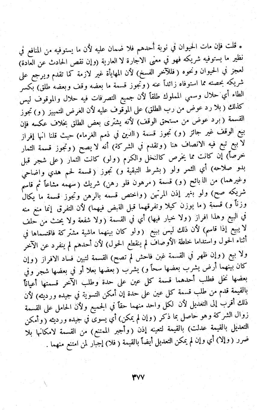قُلْت فَإِنْ مَاتَ الْحَيَوَانُ فِي نَوْبَةِ أَحَدِهِمْ فَلَا ضَمَانَ عَلَيْهِ لِأَنَّ مَا يَسْتَوْفِيهِ مِنْ الْمَنَافِعِ فِي نَظِيرِ مَا يَسْتَوْفِيهِ شَرِيكُهُ فَهُوَ فِي مَعْنَى الْإِجَارَةِ لَا الْعَارِيَّةِ (وَإِنْ نَقَصَ الْحَادِثُ عَنْ الْعَادَةِ) لِعَجْزٍ فِي الْحَيَوَانِ وَنَحْوِهِ (فَلِلْآخَرِ الْفَسْخُ) لِأَنَّ الْمُهَايَأَةَ غَيْرُ لَازِمَةٍ كَمَا تَقَدَّمَ، وَيَرْجِعُ عَلَى شَرِيكِهِ بِحِصَّتِهِ مِمَّا اسْتَوْفَاهُ زَائِدًا عَنْهُ (وَتَجُوزُ قِسْمَةُ مَا بَعْضُهُ وَقْفٌ وَبَعْضُهُ طِلْقٌ) بِكَسْرِ الطَّاءِ أَيْ حَلَالٌ، وَسُمِّيَ الْمَمْلُوكُ طِلْقًا لِأَنَّ جَمِيعَ التَّصَرُّفَاتِ فِيهِ حَلَالٌ وَالْمَوْقُوفُ لَيْسَ كَذَلِكَ (بِلَا رَدِّ عِوَضٍ مِنْ رَبِّ الطِّلْقِ) عَلَى الْمَوْقُوفِ عَلَيْهِ لِأَنَّ الْغَرَضَ التَّمْيِيزُ.