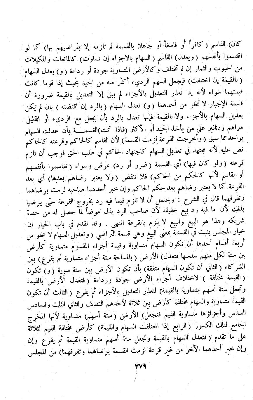 وَقَدْ تَقَدَّمَ فِي بَابِ الْخِيَارِ أَنَّ خِيَارَ الْمَجْلِسِ يَثْبُتُ فِي الْقِسْمَةِ بِمَعْنَى الْبَيْعِ وَهِيَ قِسْمَةُ التَّرَاضِي (وَتَعْدِيلُ السِّهَامِ لَا يَخْلُو مِنْ أَرْبَعَةِ أَقْسَامٍ أَحَدُهَا أَنْ تَكُونَ السِّهَامُ مُتَسَاوِيَةً وَقِيمَةُ أَجْزَاءِ الْمَقْسُومِ مُتَسَاوِيَةً كَأَرْضٍ بَيْنَ سِتَّةٍ لِكُلٍّ مِنْهُمْ سُدُسُهَا فَتُعَدَّلُ) الْأَرْضُ (بِالْمَسَّاحَةِ سِتَّةَ أَجْزَاءٍ مُتَسَاوِيَةً ثُمَّ يَقْرَعُ) بَيْنَ الشُّرَكَاءِ (الثَّانِي: أَنْ تَكُونَ السِّهَامُ مُتَّفِقَةً) بِأَنْ تَكُونَ الْأَرْضُ بَيْنَ سِتَّةٍ سَوِيَّةً.