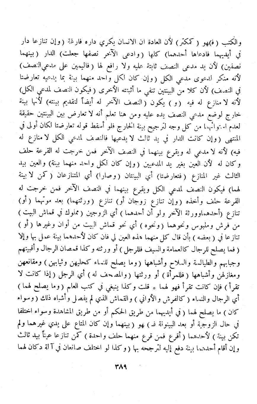 (وَإِنْ تَنَازَعَ زَوْجَانِ أَوْ) تَنَازَعَ (وَرَثَتُهُمَا) بَعْدَ مَوْتِهِمَا (أَوْ) تَنَازَعَ (أَحَدُهُمَا وَوَرَثَةُ الْآخَرِ وَلَوْ أَنَّ أَحَدَهُمَا) أَيْ الزَّوْجَيْنِ (مَمْلُوكٌ فِي قُمَاشِ الْبَيْتِ) مِنْ فُرُشٍ وَمَلْبُوسٍ وَنَحْوِهِمَا (وَنَحْوِهِ) أَيْ نَحْوِ قُمَاشِ الْبَيْتِ مِنْ أَوَانٍ وَغَيْرِهَا (أَوْ) تَنَازَعَا فِي (بَعْضِهِ) بِأَنْ قَالَ كُلٌّ مِنْهُمَا هَذِهِ الْعَيْنُ لِي فَإِنْ كَانَ لِأَحَدِهِمَا بَيِّنَةٌ عُمِلَ بِهَا وَإِلَّا (فَمَا يَصْلُحُ لِلرِّجَالِ كَالْعِمَامَةِ وَالسَّيْفِ فَلِلرَّجُلِ) أَوْ وَرَثَتِهِ وَكَذَا قُمْصَانُ الرِّجَالِ وَأَقْبِيَتُهُمْ وَجِبَابُهُمْ وَالطَّيَالِسَةُ وَالسِّلَاحُ وَأَشْبَاهُهَا (وَمَا يَصْلُحُ لِلنِّسَاءِ كَحُلِيِّهِنَّ وَثِيَابِهِنَّ) وَمَقَانِعِهِنَّ وَمَغَازِلِهِنَّ وَأَشْبَاهِهَا (فَلِلْمَرْأَةِ) أَوْ وَرَثَتِهَا (وَالْمُصْحَفُ لَهُ) أَيْ الرَّجُلِ (إذَا كَانَتْ لَا تَقْرَأُ) فَإِنْ كَانَتْ تَقْرَأُ فَهُوَ لَهُمَا قُلْتُ: وَكَذَا يَنْبَغِي فِي كُتُبِ الْعِلْمِ (وَمَا يَصْلُحُ لَهُمَا) أَيْ الرِّجَالِ وَالنِّسَاءِ (كَالْفُرُشِ وَالْأَوَانِي) وَالْقُمَاشِ الَّذِي لَمْ يُفَصَّلْ وَأَشْبَاهِ ذَلِكَ (وَسَوَاءٌ كَانَ) مَا يَصْلُحُ لَهُمَا (فِي أَيْدِيهِمَا مِنْ طَرِيقِ الْحُكْمِ أَوْ مِنْ طَرِيقِ الْمُشَاهَدَةِ وَسَوَاءٌ اخْتَلَفَا فِي حَالِ الزَّوْجِيَّةِ أَوْ بَعْدَ الْبَيْنُونَةِ فَ) هُوَ (بَيْنَهُمَا وَإِنْ كَانَ الْمَتَاعُ عَلَى يَدَيْ غَيْرِهِمَا وَلَمْ تَكُنْ بَيِّنَةٌ) لِأَحَدِهِمَا (أَقْرَعَ فَمَنْ قَرَعَ مِنْهُمَا حَلَفَ وَاحِدَةً) كَمَنْ تَنَازَعَا عَيْنًا بِيَدِ ثَالِثٍ وَإِنْ أَقَامَ أَحَدُهُمَا بَيِّنَةً دُفِعَ إلَيْهِ لِتَرَجُّحِهِ بِهَا.