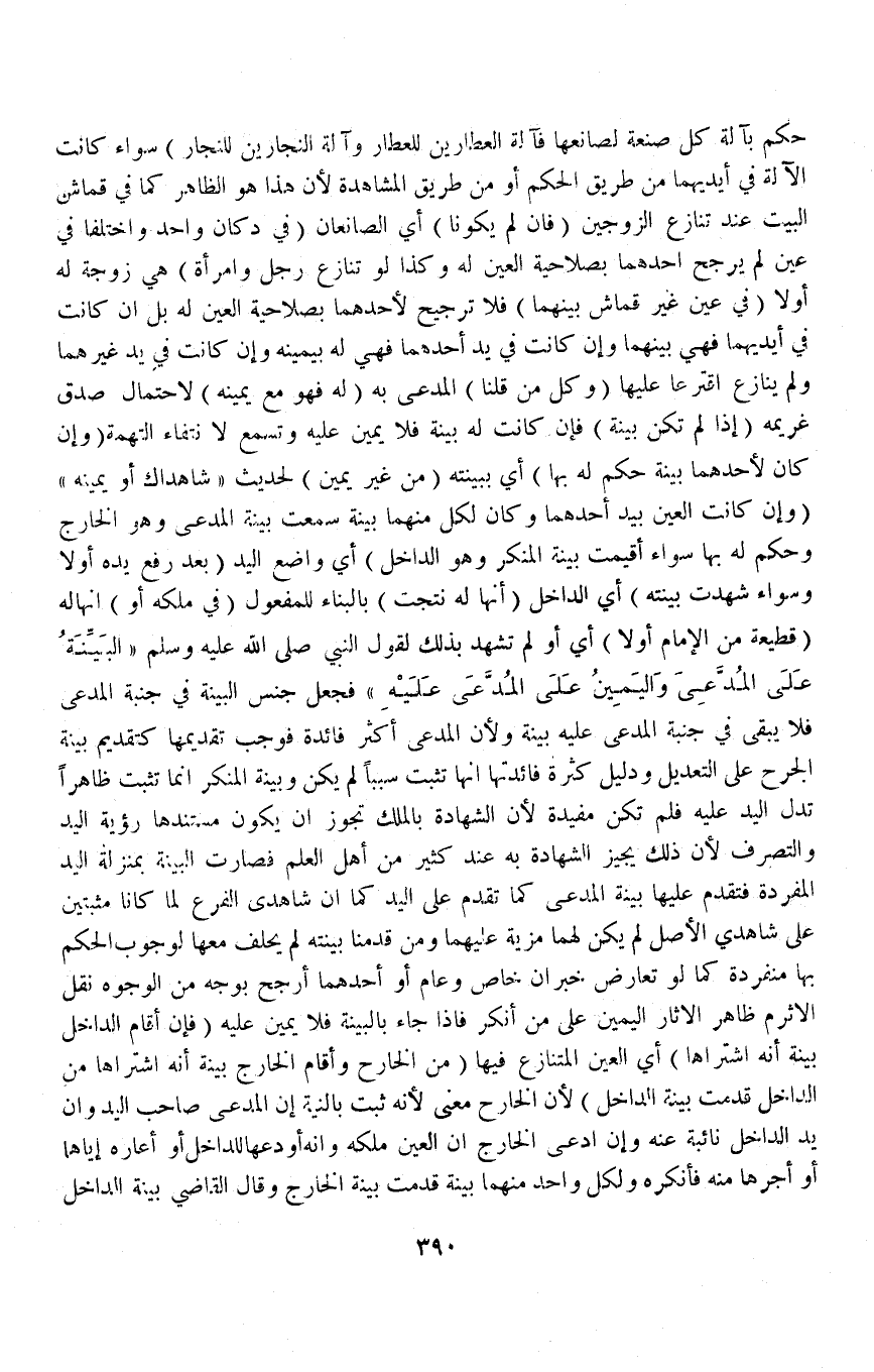 حَكَمَ بِآلَةِ كُلِّ صَنْعَةٍ لِصَانِعِهَا فَآلَةُ الْعَطَّارِينَ لِلْعَطَّارِ وَآلَةُ النَّجَّارِينَ لِلنَّجَّارِ) سَوَاءٌ كَانَتْ الْآلَةُ فِي أَيْدِيهِمَا مِنْ طَرِيقِ الْحُكْمِ أَوْ مِنْ طَرِيقِ الْمُشَاهَدَةِ لِأَنَّ هَذَا هُوَ الظَّاهِرُ كَمَا فِي قُمَاشِ الْبَيْتِ عِنْدَ تَنَازُعِ الزَّوْجَيْنِ (فَإِنْ لَمْ يَكُونَا) أَيْ الصَّانِعَانِ (فِي دُكَّانٍ وَاحِدٍ وَاخْتَلَفَا فِي عَيْنٍ لَمْ يُرَجِّحْ أَحَدُهُمَا بِصَلَاحِيَّةِ الْعَيْنِ لَهُ) .