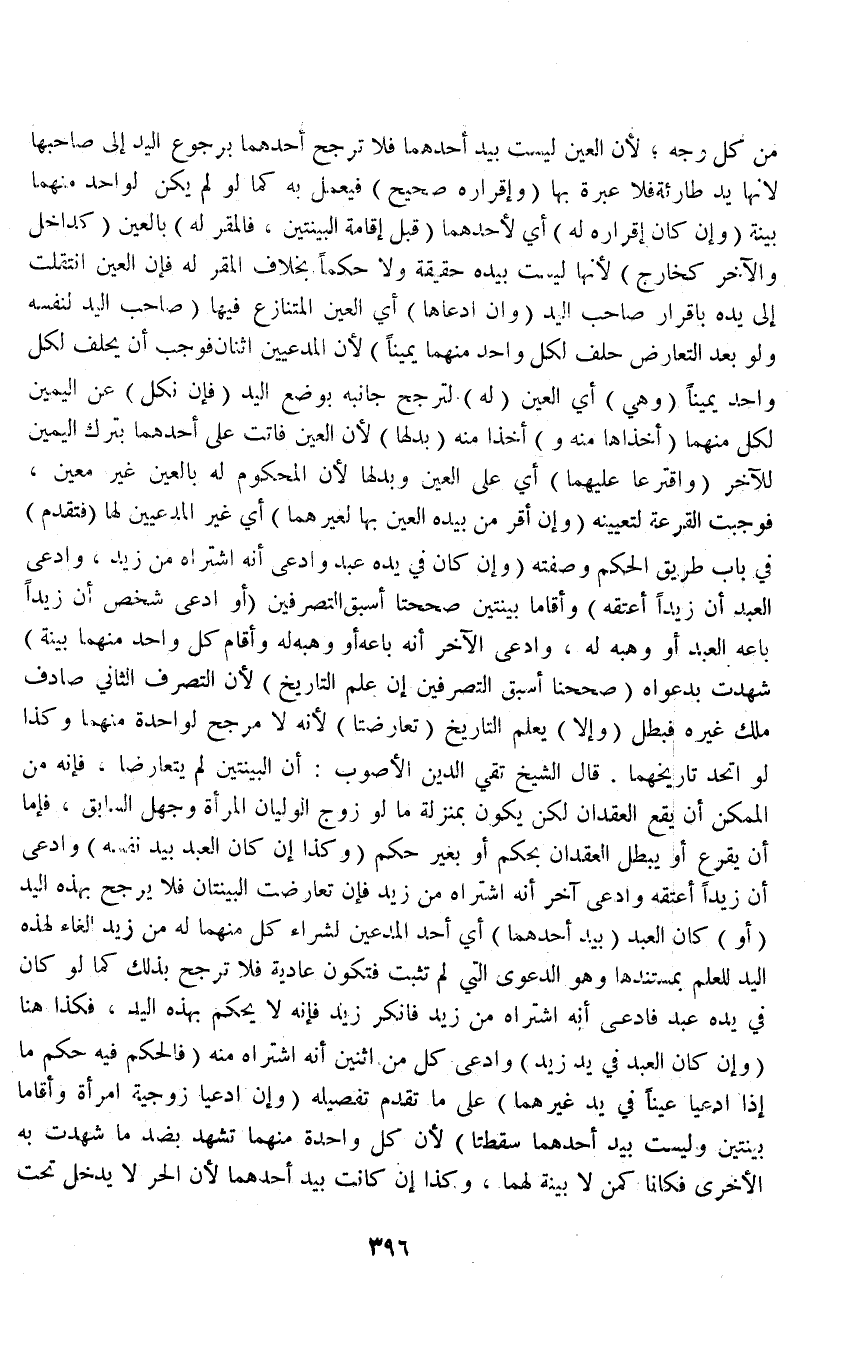 (وَإِنْ كَانَ فِي يَدِهِ عَبْدٌ وَادَّعَى أَنَّهُ اشْتَرَاهُ مِنْ زَيْدٍ، وَادَّعَى الْعَبْدُ أَنَّ زَيْدًا أَعْتَقَهُ) وَأَقَامَا بَيِّنَتَيْنِ صَحَّحَتَا أَسْبَقَ التَّصَرُّفَيْنِ (أَوْ ادَّعَى شَخْصٌ أَنَّ زَيْدًا بَاعَهُ الْعَبْدَ أَوْ وَهَبَهُ لَهُ، وَادَّعَى الْآخَر أَنَّهُ بَاعَهُ أَوْ وَهَبَهُ لَهُ وَأَقَامَ كُلُّ وَاحِدٍ مِنْهُمَا بَيِّنَةً) شَهِدَتْ بِدَعْوَاهُ (صَحَّحْنَا أَسْبَقَ التَّصَرُّفَيْنِ إنْ عُلِمَ التَّارِيخُ) لِأَنَّ التَّصَرُّفَ الثَّانِيَ صَادَفَ مِلْكَ غَيْرِهِ فَبَطَلَ (وَإِلَّا) يُعْلَمُ التَّارِيخُ (تَعَارَضَتَا) لِأَنَّهُ لَا مُرَجِّحَ لِوَاحِدَةٍ مِنْهُمَا وَكَذَا لَوْ اتَّحَدَ تَارِيخُهُمَا قَالَ الشَّيْخُ تَقِيُّ الدِّينِ الْأَصْوَبُ: أَنَّ الْبَيِّنَتَيْنِ لَمْ يَتَعَارَضَا، فَإِنَّهُ مِنْ الْمُمْكِنِ أَنْ يَقَعَ الْعَقْدَانِ لَكِنْ يَكُونُ بِمَنْزِلَةِ مَا لَوْ زَوَّجَ الْوَلِيَّانِ الْمَرْأَةَ وَجَهِلَ السَّابِقُ، فَإِمَّا أَنْ يُقْرَعَ أَوْ يَبْطُلَ الْعَقْدَانِ بِحُكْمٍ أَوْ بِغَيْرِ حُكْمٍ (وَكَذَا إنْ كَانَ الْعَبْدُ بِيَدِ نَفْسِهِ) وَادَّعَى أَنَّ زَيْدًا أَعْتَقَهُ وَادَّعَى آخَرُ أَنَّهُ اشْتَرَاهُ مِنْ زَيْدٍ فَإِنْ تَعَارَضَتْ الْبَيِّنَتَانِ فَلَا يُرَجَّحُ بِهَذِهِ الْيَدِ (أَوْ) كَانَ الْعَبْدُ (بِيَدِ أَحَدِهِمَا) أَيْ أَحَدِ الْمُدَّعِينَ لِشِرَاءِ كُلٍّ مِنْهُمَا لَهُ مِنْ زَيْدٍ إلْغَاءً لِهَذِهِ الْيَدِ لِلْعِلْمِ بِمُسْتَنَدِهَا وَهُوَ الدَّعْوَى الَّتِي لَمْ تَثْبُتْ فَتَكُونُ عَادِيَّةً فَلَا تُرَجَّحُ بِذَلِكَ كَمَا لَوْ كَانَ فِي يَدِهِ عَبْدٌ فَادَّعَى أَنَّهُ اشْتَرَاهُ مِنْ زَيْدٍ فَأَنْكَرَ زَيْدٌ فَإِنَّهُ لَا يُحْكَمُ بِهَذِهِ الْيَدِ، فَكَذَا هُنَا.