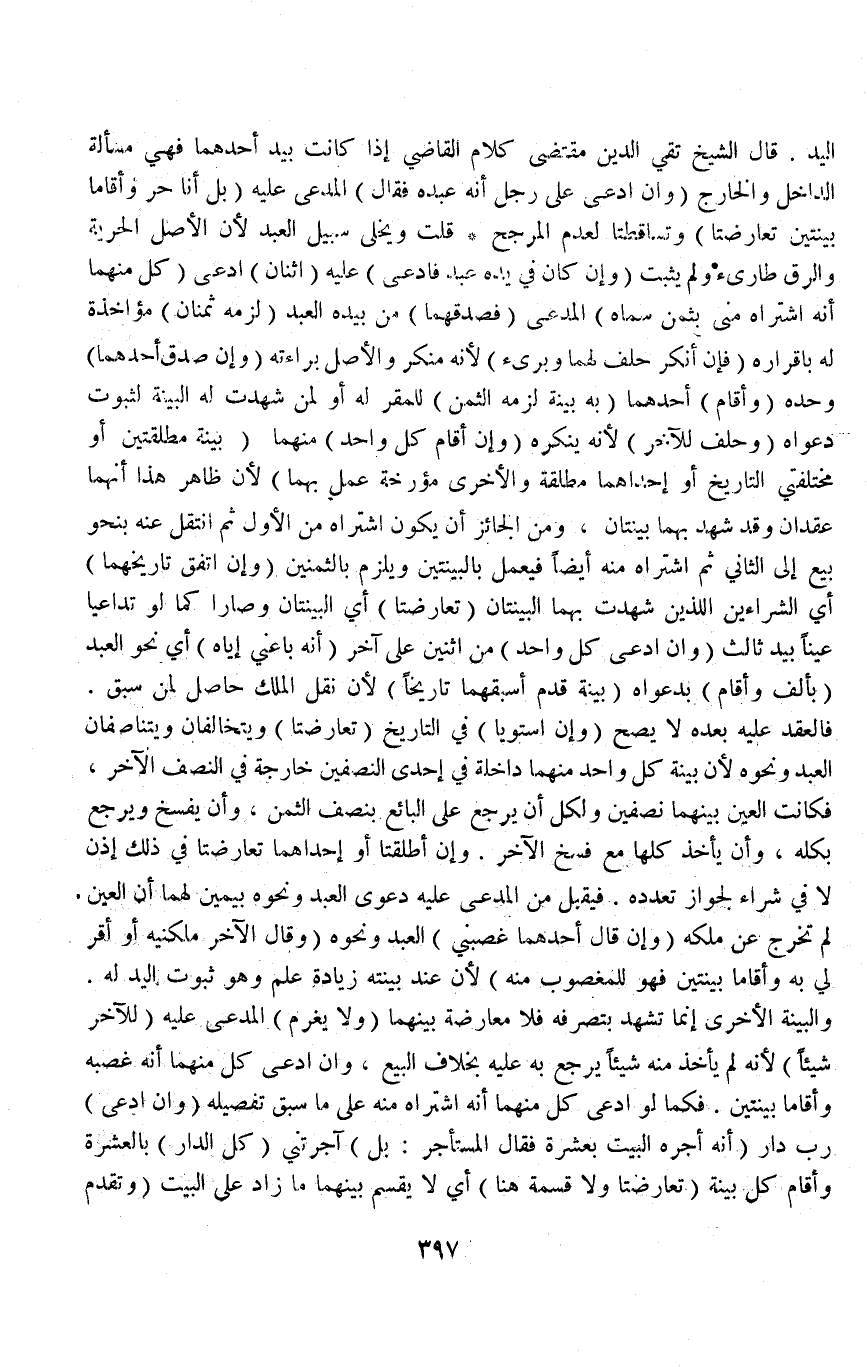 قَالَ الشَّيْخُ تَقِيُّ الدِّينِ مُقْتَضَى كَلَامِ الْقَاضِي إذَا كَانَتْ بِيَدِ أَحَدِهِمَا فَهِيَ مَسْأَلَةُ الدَّاخِلِ وَالْخَارِجِ (وَإِنْ ادَّعَى عَلَى رَجُلٍ أَنَّهُ عَبْدُهُ فَقَالَ) الْمُدَّعَى عَلَيْهِ (بَلْ أَنَا حُرٌّ وَأَقَامَا بَيِّنَتَيْنِ تَعَارَضَتَا) وَتَسَاقَطَتَا لِعَدَمِ الْمُرَجِّحِ قُلْتُ وَيُخْلَى سَبِيلُ الْعَبْدِ لِأَنَّ الْأَصْلَ الْحُرِّيَّةُ وَالرِّقُّ طَارِئٌ وَلَمْ يَثْبُتْ (وَإِنْ كَانَ فِي يَدِهِ عَبْدٌ فَادَّعَى) عَلَيْهِ (اثْنَانِ) ادَّعَى (كُلٌّ مِنْهُمَا أَنَّهُ اشْتَرَاهُ مِنِّي بِثَمَنٍ سَمَّاهُ) الْمُدَّعِي (فَصَدَّقَهُمَا) مَنْ بِيَدِهِ الْعَبْدُ (لَزِمَهُ ثَمَنَانِ) مُؤَاخَذَةً لَهُ بِإِقْرَارِهِ (فَإِنْ أَنْكَرَ حَلَفَ لَهُمَا وَبَرِئَ) لِأَنَّهُ مُنْكَرٌ وَالْأَصْلُ بَرَاءَتُهُ (وَإِنْ صَدَّقَ أَحَدَهُمَا) وَحْدَهُ (وَأَقَامَ) أَحَدُهُمَا (بِهِ بَيِّنَةً لَزِمَهُ الثَّمَنُ) لِلْمُقَرِّ لَهُ أَوْ لِمَنْ شَهِدَتْ لَهُ الْبَيِّنَةُ لِثُبُوتِ دَعْوَاهُ (وَحَلَفَ لِلْآخَرِ) لِأَنَّهُ يُنْكِرُهُ (وَإِنْ أَقَامَ كُلُّ وَاحِدٍ) مِنْهُمَا (بَيِّنَةً مُطْلَقَتَيْنِ أَوْ مُخْتَلِفَتَيْ التَّارِيخِ أَوْ إحْدَاهُمَا مُطْلَقَةً وَالْأُخْرَى مُؤَرَّخَةً عُمِلَ بِهِمَا) لِأَنَّ ظَاهِرَ هَذَا أَنَّهُمَا عَقْدَانِ وَقَدْ شَهِدَ بِهِمَا بَيِّنَتَانِ، وَمِنْ الْجَائِزِ أَنْ يَكُونَ اشْتَرَاهُ مِنْ الْأَوَّلِ ثُمَّ انْتَقَلَ عَنْهُ بِنَحْوِ بَيْعٍ إلَى الثَّانِي ثُمَّ اشْتَرَاهُ مِنْهُ أَيْضًا فَيُعْمَلُ بِالْبَيِّنَتَيْنِ وَيُلْزَمُ بِالثَّمَنَيْنِ.
