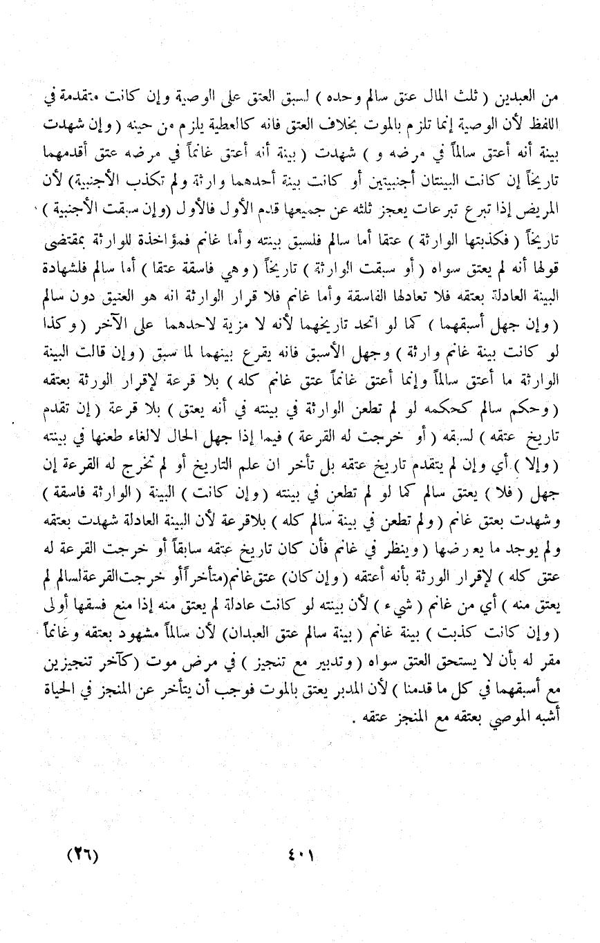 (وَحُكْمُ سَالِمٍ كَحُكْمِهِ لَوْ لَمْ تَطْعَنْ الْوَارِثَةُ فِي بَيِّنَتِهِ فِي أَنَّهُ يُعْتَقُ) بِلَا قُرْعَةٍ (إنْ تَقَدَّمَ تَارِيخُ عِتْقِهِ) لِسَبْقِهِ (أَوْ خَرَجَتْ لَهُ الْقُرْعَةُ) فِيمَا إذَا جُهِلَ الْحَالُ لِإِلْغَاءِ طَعْنِهَا فِي بَيِّنَتِهِ، (وَإِلَّا) أَيْ وَإِنْ لَمْ يَتَقَدَّمْ تَارِيخُ عِتْقِهِ بَلْ تَأَخَّرَ إنْ عُلِمَ التَّارِيخُ أَوْ لَمْ تَخْرُجْ لَهُ الْقُرْعَةُ إنْ جُهِلَ (فَلَا) يَعْتِقُ سَالِمٌ كَمَا لَوْ لَمْ تَطْعَنْ فِي بَيِّنَتِهِ (وَإِنْ كَانَتْ) الْبَيِّنَةُ (الْوَارِثَةُ فَاسِقَةً) وَشَهِدَتْ بِعِتْقِ غَانِمٍ (وَلَمْ تَطْعَنْ فِي بَيِّنَةِ سَالِمٍ كُلِّهِ) بِلَا قُرْعَةٍ لِأَنَّ الْبَيِّنَةَ الْعَادِلَةَ شَهِدَتْ بِعِتْقِهِ وَلَمْ يُوجَد مَا يُعَارِضُهَا (وَيُنْظَرُ فِي غَانِمٍ فَإِنْ كَانَ تَارِيخُ عِتْقِهِ سَابِقًا، أَوْ خَرَجَتْ الْقُرْعَةُ لَهُ عَتَقَ كُلُّهُ) لِإِقْرَارِ الْوَرَثَةِ بِأَنَّهُ أَعْتَقَهُ.