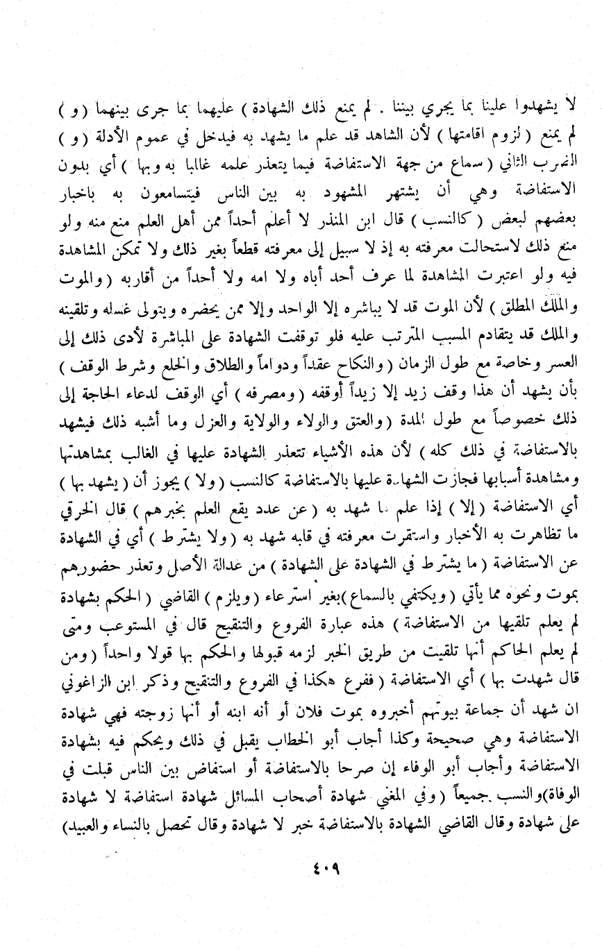 (وَمَنْ قَالَ شَهِدْتُ بِهَا) أَيْ الِاسْتِفَاضَةِ (فَفَرَّعَ هَكَذَا فِي الْفُرُوعِ وَالتَّنْقِيحِ وَذَكَرَ ابْنُ الزَّاغُونِيِّ إنْ شَهِدَ أَنَّ جَمَاعَةَ بُيُوتِهِمْ أَخْبَرُوهُ بِمَوْتِ فُلَانٍ أَوْ أَنَّهُ ابْنُهُ أَوْ أَنَّهَا زَوْجَتُهُ فَهِيَ شَهَادَةُ الِاسْتِفَاضَةِ وَهِيَ صَحِيحَةٌ وَكَذَا أَجَابَ أَبُو الْخَطَّابِ يَقْبَلُ فِي ذَلِكَ وَيَحْكُمُ فِيهِ بِشَهَادَةِ الِاسْتِفَاضَةِ وَأَجَابَ أَبُو الْوَفَاءِ إنْ صَرَّحَ بِالِاسْتِفَاضَةِ أَوْ اسْتَفَاضَ بَيْنَ النَّاسِ قُبِلَتْ فِي الْوَفَاةِ) وَالنَّسَبِ جَمِيعًا (وَفِي الْمُغْنِي شَهَادَةُ أَصْحَابِ الْمَسَائِلِ شَهَادَةُ اسْتِفَاضَةٍ لَا شَهَادَةٌ عَلَى شَهَادَةٍ وَقَالَ الْقَاضِي الشَّهَادَةُ بِالِاسْتِفَاضَةِ خَبَرٌ لَا شَهَادَةٌ وَقَالَ تَحْصُلُ بِالنِّسَاءِ وَالْعَبِيدِ)