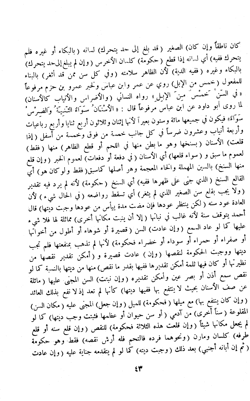 (وَفِي كُلِّ سِنٍّ مِمَّنْ قَدْ أُثْغِرَ) بِالْبِنَاءِ لِلْمَفْعُولِ (خَمْسٌ مِنْ الْإِبِلِ) رُوِيَ عَنْ عُمَرَ وَابْنِ عَبَّاسٍ وَلِخَبَرِ عَمْرِو بْنِ حَزْمٍ مَرْفُوعًا «فِي السِّنِّ خَمْسٌ مِنْ الْإِبِلِ» رَوَاهُ النَّسَائِيُّ (وَالْأَضْرَاسُ وَالْأَنْيَابُ كَالْأَسْنَانِ) لِمَا رَوَى أَبُو دَاوُد عَنْ ابْنِ عَبَّاسٍ مَرْفُوعًا قَالَ: «الْأَسْنَانُ سَوَاءٌ الثَّنِيَّةُ وَالضِّرْسُ سَوَاءٌ» فَيَكُونُ فِي جَمِيعِهَا مِائَةٌ وَسِتُّونَ بَعِيرًا لِأَنَّهَا اثْنَانِ وَثَلَاثُونَ أَرْبَعُ ثَنَايَا وَأَرْبَعُ رُبَاعِيَّاتٍ وَأَرْبَعَةُ أَنْيَابٍ وَعِشْرُونَ ضِرْسًا فِي كُلِّ جَانِبٍ خَمْسَةٌ مِنْ فَوْقَ وَخَمْسَةُ مِنْ أَسْفَلَ (إذَا قُلِعَتْ) الْأَسْنَانُ (بِسَنِخِهَا وَهُوَ مَا بَطَنَ مِنْهَا فِي اللَّحْمِ أَوْ قَطَعَ الظَّاهِرُ) مِنْهَا (فَقَطْ) لِعُمُومِ مَا سَبَقَ وَ (سَوَاءٌ قَلَعَهَا) أَيْ الْأَسْنَانَ (فِي دَفْعَةٍ أَوْ دَفَعَاتٍ) لِعُمُومِ الْخَبَرِ (وَإِنْ قَلَعَ مِنْهَا السَّنِخُ) بِالسِّينِ الْمُهْمَلَةِ وَالْخَاءِ الْمُعْجَمَةِ وَهُوَ أَصْلُهَا كَمَا سَبَقَ (فَقَطْ وَلَوْ كَانَ هُوَ) أَيْ الْقَالِعُ السَّنِخُ (الَّذِي جَنَى عَلَى ظَهْرِهَا فَفِيهِ) أَيْ السَّنِخِ (حُكُومَةٌ) لِأَنَّهُ لَمْ يَرِدْ فِيهِ تَقْدِيرٌ.