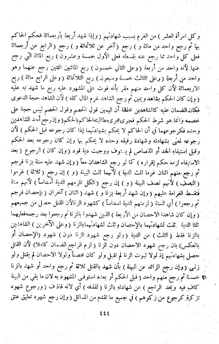 (وَإِذَا شَهِدَ أَرْبَعَةٌ بِأَرْبَعِمِائَةٍ فَحَكَمَ الْحَاكِمُ بِهَا ثُمَّ رَجَعَ وَاحِدٌ مِنْ مِائَةٍ وَ) رَجَعَ (آخَرُ عَنْ ثَلَاثِمِائَةٍ وَ) رَجَعَ (الرَّابِعُ عَنْ أَرْبَعِمِائَةٍ فَعَلَى كُلِّ وَاحِدٍ مِمَّا رَجَعَ عَنْهُ بِقِسْطِهِ فَعَلَى الْأَوَّلِ خَمْسَةٌ وَعِشْرُونَ) رُبْعُ الْمِائَةِ الَّتِي رَجَعَ عَنْهَا لِأَنَّهُ وَاحِدٌ مِنْ أَرْبَعَةٍ (وَعَلَى الثَّانِي خَمْسُونَ) رُبْعُ الْمِائَتَيْنِ اللَّتَيْنِ رَجَعَ عَنْهُمَا وَهُوَ وَاحِدٌ مِنْ أَرْبَعَةٍ (وَعَلَى الثَّالِثِ خَمْسَةٌ وَسَبْعُونَ) رُبُعُ الثَّلَاثِمِائَةِ (وَعَلَى الرَّابِعِ مِائَةٌ) رُبْعُ الْأَرْبَعِمِائَة لِأَنَّ كُلَّ وَاحِدٍ مِنْهُمْ مُقِرٌّ بِأَنَّهُ فَوَّتَ عَلَى الْمَشْهُودِ عَلَيْهِ رُبْعَ مَا شَهِدَ بِهِ عَلَيْهِ.
