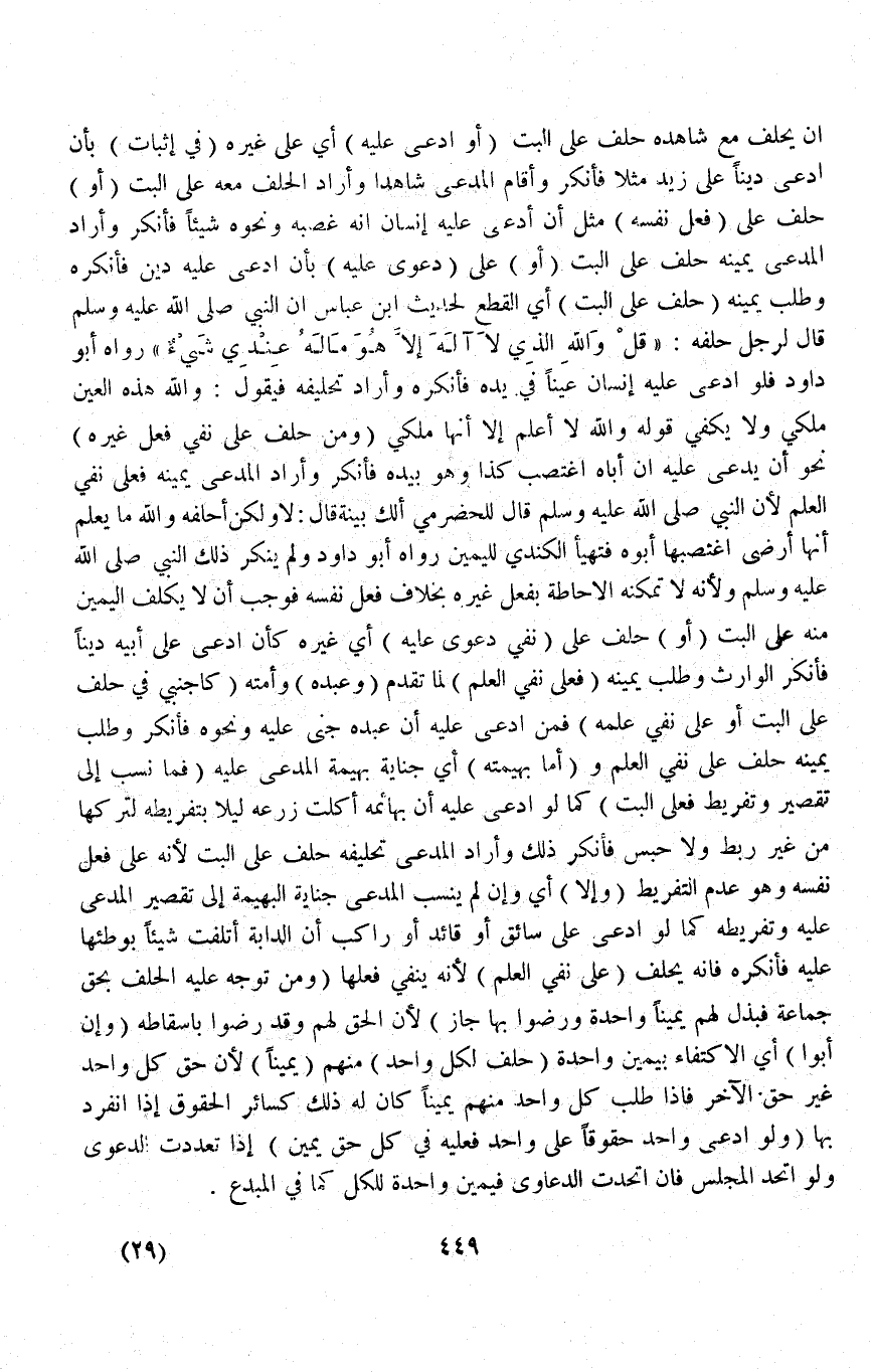 (وَمَنْ حَلَفَ عَلَى نَفْيِ فِعْلِ غَيْرِهِ) نَحْوَ أَنْ يَدَّعِيَ عَلَيْهِ أَنَّ أَبَاهُ اغْتَصَبَ كَذَا وَهُوَ بِيَدِهِ فَأَنْكَرَ وَأَرَادَ الْمُدَّعِي يَمِينَهُ فَعَلَى نَفْيِ الْعِلْمِ «لِأَنَّ النَّبِيَّ - صَلَّى اللَّهُ عَلَيْهِ وَسَلَّمَ - قَالَ لِلْحَضْرَمِيِّ أَلَكَ بَيِّنَةٌ قَالَ: لَا وَلَكِنْ أُحَلِّفُهُ وَاَللَّهِ مَا يَعْلَمُ أَنَّهَا أَرْضِي اغْتَصَبَهَا أَبُوهُ فَتَهَيَّأَ الْكِنْدِيُّ لِلْيَمِينِ» رَوَاهُ أَبُو دَاوُد وَلَمْ يُنْكِرْ ذَلِكَ النَّبِيُّ - صَلَّى اللَّهُ عَلَيْهِ وَسَلَّمَ - وَلِأَنَّهُ لَا تُمْكِنُهُ الْإِحَاطَةُ بِفِعْلِ غَيْرِهِ بِخِلَافِ فِعْلِ نَفْسِهِ فَوَجَبَ أَنْ لَا يُكَلَّفَ، الْيَمِينَ مِنْهُ عَلَى الْبَتِّ (أَوْ) حَلَفَ عَلَى (نَفْيِ دَعْوَى عَلَيْهِ) أَيْ غَيْرِهِ كَأَنَّ ادَّعَى عَلَى أَبِيهِ دَيْنًا فَأَنْكَرَ الْوَارِث وَطَلَبَ يَمِينَهُ (فَعَلَى نَفْيِ الْعِلْمِ) لِمَا تَقَدَّمَ (وَعَبْدِهِ) وَأَمَتِهِ (كَأَجْنَبِيٍّ فِي حَلِفٍ عَلَى الْبَتِّ أَوْ عَلَى نَفْيِ عِلْمِهِ) فَمَنْ ادَّعَى عَلَيْهِ أَنَّ عَبْدَهُ جَنَى عَلَيْهِ وَنَحْوَهُ فَأَنْكَرَ وَطَلَبَ يَمِينَهُ حَلَفَ عَلَى نَفْيِ الْعِلْمِ.