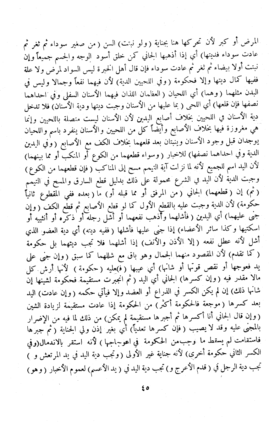 (وَإِنْ جَنَى عَلَى يَدٍ فَعَوَّجَهَا أَوْ نَقَّصَ قُوَّتهَا أَوْ شَانَهَا) أَيْ عَيَّبَهَا (ف) عَلَيْهِ (حُكُومَةٌ) لِأَنَّهَا أَرْشُ كُلِّ مَا لَا مُقَدَّرَ فِيهِ (وَإِنْ كَسَرَهَا) الْجَانِي أَيْ الْيَدَ (ثُمَّ انْجَبَرَتْ مُسْتَقِيمَةً فَحُكُومَةٌ لِشَيْنِهَا إنْ شَانَهَا ذَلِكَ) إنْ لَمْ يَكُنِ الْكَسْرُ فِي الذِّرَاعِ أَوْ الْعَضُدِ وَإِلَّا فَيَأْتِي حُكْمُهُ (وَإِنْ عَادَتْ) الْيَدُ بَعْد كَسْرِهَا (مُعْوَجَّةً فَالْحُكُومَةُ أَكْثَرُ) مِنْ الْحُكُومَةِ إذَا عَادَتْ مُسْتَقِيمَةً لِزِيَادَةِ الشَّيْنِ (وَإِنْ قَالَ الْجَانِي أَنَا أَكْسِرُهَا ثُمَّ أَجْبُرَهَا مُسْتَقِيمَةً لَمْ يُمَكَّنْ) مِنْ ذَلِكَ لِمَا فِيهِ مِنْ الْإِضْرَارِ بِالْمَجْنِيِّ عَلَيْهِ وَقَدْ لَا يُصِيبُ (فَإِنْ كَسَرَهَا تَعَدِّيًا) أَيْ بِغَيْرِ إذْنِ وَلِيِّ الْجِنَايَةِ (ثُمَّ جَبَرَهَا فَاسْتَقَامَتْ لَمْ يَسْقُطْ مَا وَجَبَ مِنْ الْحُكُومَةِ فِي اعْوِجَاجِهَا) لِأَنَّهُ اسْتَقَرَّ بِالِانْدِمَالِ (وَفِي الْكَسْرِ الثَّانِي حُكُومَةٌ أُخْرَى) لِأَنَّهُ جِنَايَةٌ غَيْرَ الْأُولَى.
