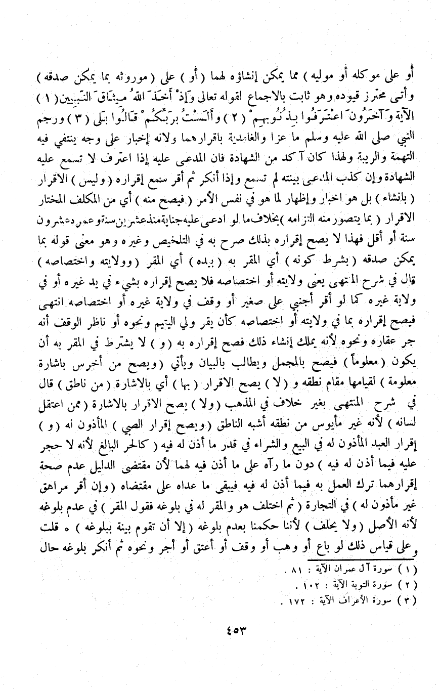 (وَإِنْ أَقَرَّ مُرَاهِقٌ غَيْرُ مَأْذُونٍ لَهُ) فِي التِّجَارَةِ (ثُمَّ اخْتَلَفَ هُوَ وَالْمُقَرُّ لَهُ فِي بُلُوغِهِ فَقَوْلُ الْمُقِرِّ) فِي عَدَمِ بُلُوغِهِ لِأَنَّهُ الْأَصْلُ (وَلَا يَحْلِفُ) لِأَنَّنَا حَكَمْنَا بِعَدَمِ بُلُوغِهِ (إلَّا أَنْ تَقُومَ بَيِّنَةٌ بِبُلُوغِهِ) قُلْتُ وَعَلَى قِيَاسِ ذَلِكَ لَوْ بَاعَ أَوْ وَهَبَ أَوْ وَقَفَ أَوْ أَعْتَقَ أَوْ أَجَّرَ وَنَحْوَهُ ثُمَّ أَنْكَرَ بُلُوغِهِ حَالَ