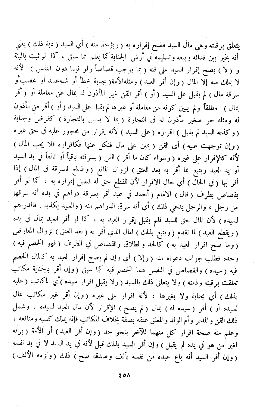 (وَإِنْ أَقَرَّ الْعَبْدُ) وَمِثْلُهُ الْأَمَةُ (بِجِنَايَةِ خَطَأٍ أَوْ شِبْهِ عَمْدٍ أَوْ غَصْبٍ أَوْ سَرِقَةِ مَالٍ) لَمْ يُقْبَلْ عَلَى السَّيِّدِ (أَوْ) أَقَرَّ الْقِنُّ غَيْرُ الْمَأْذُونِ لَهُ بِمَالٍ عَنْ مُعَامَلَةٍ أَوْ (أَقَرَّ بِمَالٍ) مُطْلَقًا وَلَمْ يُبَيِّنْ كَوْنَهُ عَنْ مُعَامَلَةٍ أَوْ غَيْرِهَا لَمْ يُقْبَلْ عَلَى السَّيِّدِ (أَوْ) أَقَرَّ مِنْ مَأْذُونٍ لَهُ وَمِثْلُهُ حُرٌّ صَغِيرٌ مَأْذُونٌ لَهُ فِي التِّجَارَةِ (بِمَا لَا يَتَعَلَّقُ بِالتِّجَارَةِ) كَقَرْضٍ وَجِنَايَةٍ (وَكَذَّبَهُ السَّيِّدُ لَمْ يُقْبَلْ) إقْرَارُهُ (عَلَى السَّيِّدِ) لِأَنَّهُ إقْرَارٌ مِنْ مَحْجُورٍ عَلَيْهِ فِي حَقِّ غَيْرِهِ.