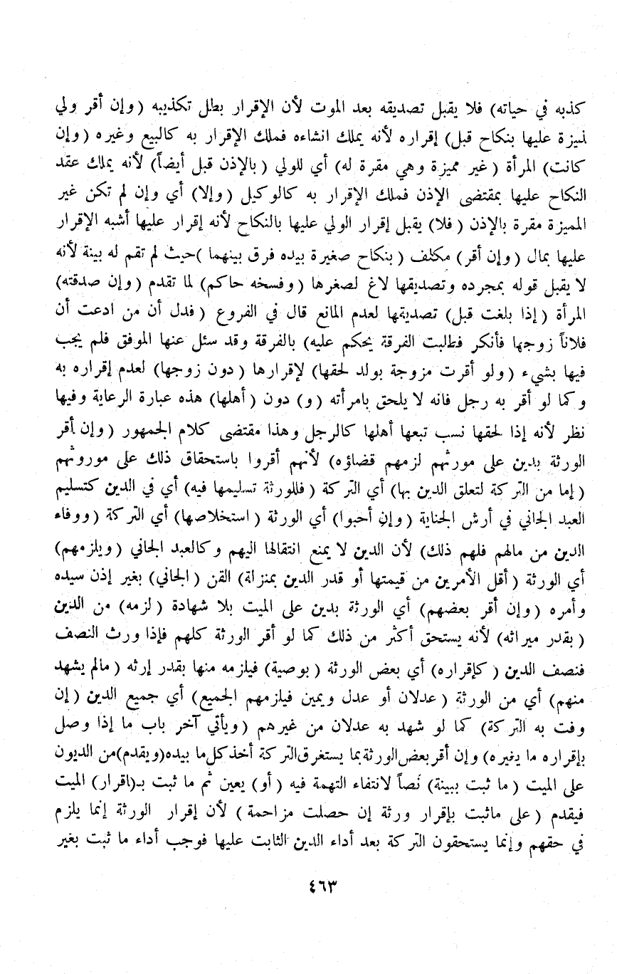 (وَإِنْ أَقَرَّ بَعْضُهُمْ) أَيْ الْوَرَثَةِ بِدَيْنٍ عَلَى الْمَيِّتِ بِلَا شَهَادَةٍ (لَزِمَهُ) مِنْ الدَّيْنِ (بِقَدْرِ مِيرَاثِهِ) لِأَنَّهُ يَسْتَحِقُّ أَكْثَرَ مِنْ ذَلِكَ كَمَا لَوْ أَقَرَّ الْوَرَثَةُ كُلُّهُمْ فَإِذَا وَرِثَ النِّصْفَ فَنِصْفُ الدَّيْنِ (كَإِقْرَارِهِ) أَيْ بَعْضِ الْوَرَثَةِ (بِوَصِيَّةٍ) فَيَلْزَمُهُ مِنْهَا بِقَدْرِ إرْثِهِ (مَا لَمْ يَشْهَدْ مِنْهُمْ) أَيْ مِنْ الْوَرَثَةِ (عَدْلَانِ أَوْ عَدْلٌ وَيَمِينٌ فَيَلْزَمُهُمْ الْجَمِيعُ) أَيْ جَمِيعُ الدَّيْنِ (إنْ وَفَّتْ بِهِ التَّرِكَةُ) كَمَا لَوْ شَهِدَ بِهِ عَدْلَانِ مِنْ غَيْرِهِمْ (وَيَأْتِي آخِرَ بَابِ مَا إذَا وَصَلَ بِإِقْرَارِهِ مَا يُغَيِّرُهُ) .