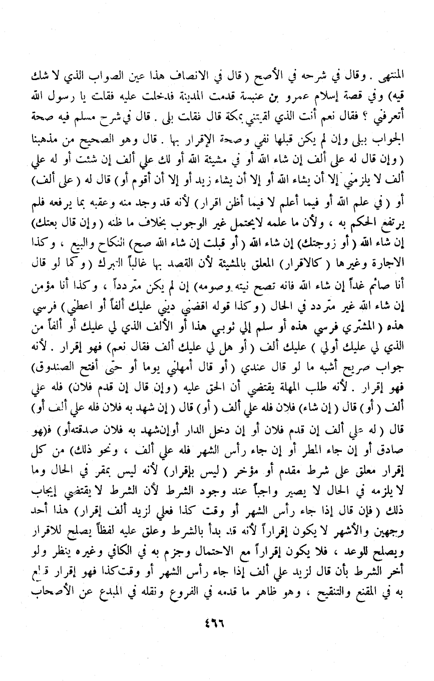 (قَالَ فِي الْإِنْصَافِ هَذَا عَيْنُ الصَّوَابِ الَّذِي لَا شَكَّ فِيهِ) «وَفِي قِصَّةِ إسْلَامِ عَمْرِو بْنِ عَنْبَسَةَ قَدِمْتُ الْمَدِينَةَ فَدَخَلْتُ عَلَيْهِ فَقُلْتُ يَا رَسُولَ اللَّهِ أَتَعْرِفُنِي؟ فَقَالَ نَعَمْ أَنْتَ الَّذِي لَقِيتَنِي بِمَكَّةَ قَالَ فَقُلْتُ بَلَى» قَالَ فِي شَرْحِ مُسْلِمٍ فِيهِ صِحَّةُ الْجَوَابِ بِبَلَى وَإِنْ لَمْ يَكُنْ قَبْلَهَا نَفْيٌ وَصِحَّةُ الْإِقْرَارِ بِهَا قَالَ وَهُوَ الصَّحِيحُ مِنْ مَذْهَبِنَا.