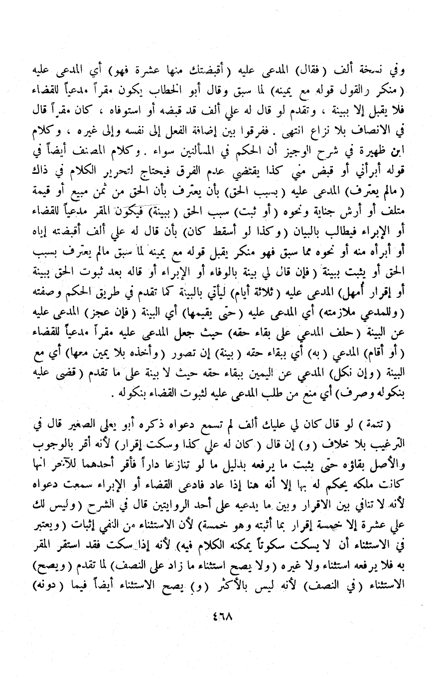 (وَكَذَا لَوْ أَسْقَطَ كَانَ) بِأَنْ قَالَ لَهُ عَلَيَّ أَلْفٌ أَقْبَضْتُهُ إيَّاهُ أَوْ أَبْرَأهُ مِنْهُ أَوْ نَحْوِهِ مِمَّا سَبَقَ فَهُوَ مُنْكِرٌ يُقْبَلُ قَوْلُهُ مَعَ يَمِينِهِ لِمَا سَبَقَ مَا لَمْ يَعْتَرِفْ بِسَبَبِ الْحَقِّ أَوْ يَثْبُتُ بِبَيِّنَةٍ (فَإِنْ قَالَ لِي بَيِّنَةٌ بِالْوَفَاءِ أَوْ الْإِبْرَاءِ أَوْ قَالَهُ بَعْدَ ثُبُوتِ الْحَقِّ بِبَيِّنَةٍ أَوْ إقْرَارٍ أُمْهِلَ) الْمُدَّعَى عَلَيْهِ (ثَلَاثَةَ أَيَّامٍ) لِيَأْتِيَ بِالْبَيِّنَةِ كَمَا تَقَدَّمَ فِي طَرِيقِ الْحُكْمِ وَصِفَتِهِ (وَلِلْمُدَّعِي مُلَازَمَتُهُ) أَيْ الْمُدَّعَى عَلَيْهِ (حَتَّى يُقِيمَهَا) أَيْ الْبَيِّنَةَ (فَإِنْ عَجِزَ الْمُدَّعَى عَلَيْهِ عَنْ الْبَيِّنَةِ حَلَفَ الْمُدَّعِي عَلَى بَقَاءِ حَقِّهِ) حَيْثُ جَعَلَ الْمُدَّعَى عَلَيْهِ مُقِرًّا مُدَّعِيًا لِلْقَضَاءِ (أَوْ أَقَامَ) الْمُدَّعِي (بِهِ) أَيْ بِبَقَاءِ حَقِّهِ بَيِّنَةً إنْ تَصَوَّرَ (وَأَخَذَهُ بِلَا يَمِينٍ مَعَهَا) أَيْ مَعَ الْبَيِّنَةِ (وَإِنْ نَكَلَ) الْمُدَّعِي عَنْ الْيَمِينِ بِبَقَاءِ حَقِّهِ حَيْثُ لَا بَيِّنَةَ عَلَى مَا تَقَدَّمَ (قُضِيَ عَلَيْهِ بِنُكُولِهِ وَصُرِفَ) أَيْ مُنِعَ مِنْ طَلَبِ الْمُدَّعَى عَلَيْهِ لِثُبُوتِ الْقَضَاءِ بِنُكُولِهِ.