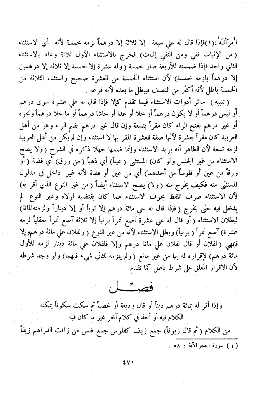 (وَلَا يَصِحُّ الِاسْتِثْنَاءُ مِنْ غَيْرِ الْجِنْسِ وَلَوْ كَانَ) الْمُسْتَثْنَى (عَيْنًا) أَيْ ذَهَبًا (مِنْ وَرِقٍ) أَيْ فِضَّةٍ (أَوْ وَرِقًا مِنْ عَيْنٍ أَوْ فُلُوسًا مِنْ أَحَدِهِمَا) أَيْ مِنْ عَيْنٍ أَوْ فِضَّةٍ لِأَنَّهُ غَيْرُ دَاخِلٍ فِي مَدْلُولِ الْمُسْتَثْنَى مِنْهُ فَكَيْفَ يَخْرُجُ مِنْهُ.