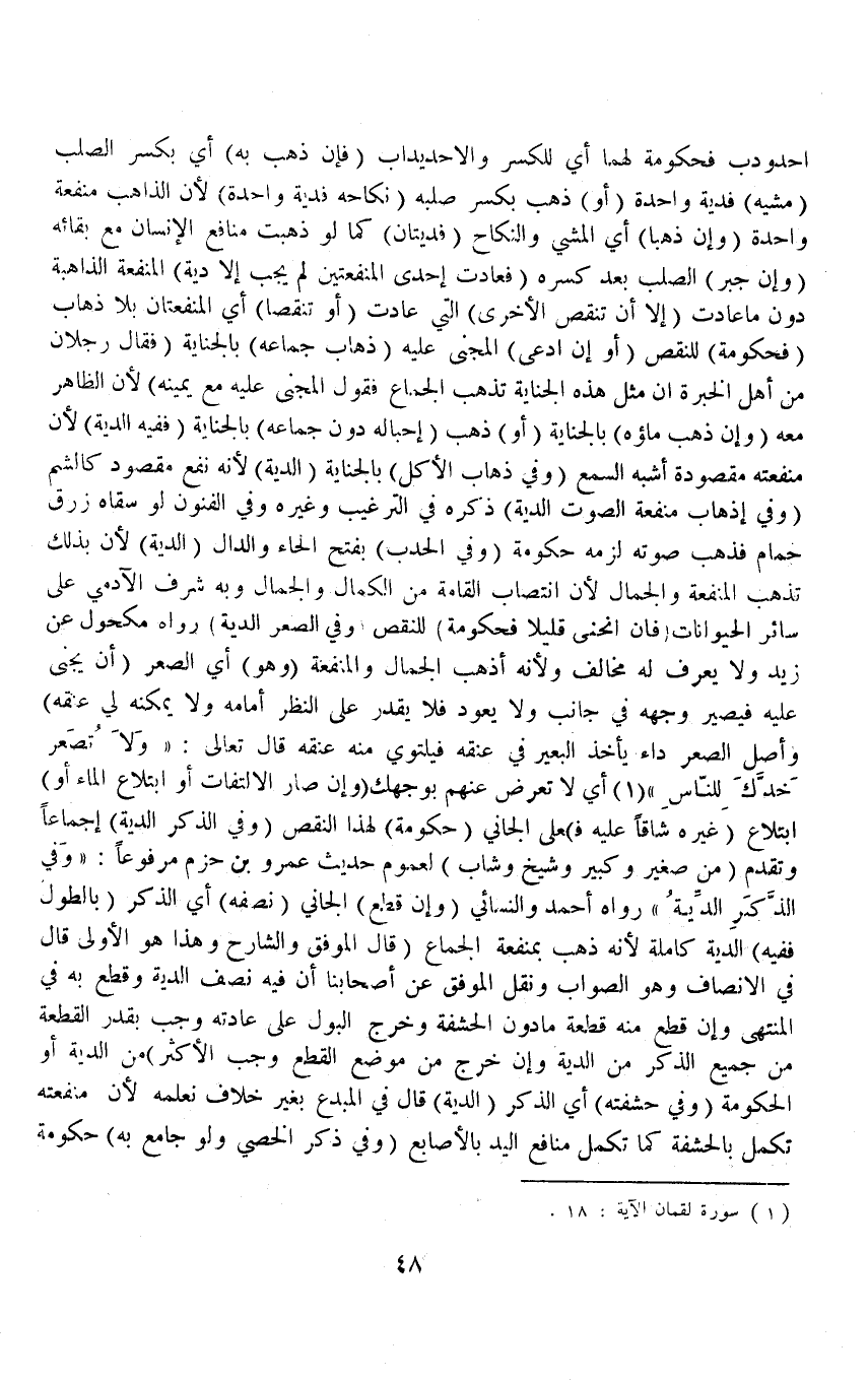 وَفِي الْفُنُونِ لَوْ سَقَاهُ زُرْق حَمَامٍ فَذَهَبَ صَوْتُهُ لَزِمَهُ حُكُومَةٌ (وَفِي الْحَدَبِ) بِفَتْحِ الْحَاءِ وَالدَّالِ (الدِّيَةُ) لِأَنَّ بِذَلِكَ تَذْهَبُ الْمَنْفَعَةُ وَالْجَمَالُ لِأَنَّ انْتِصَابَ الْقَامَةِ مِنْ الْكَمَالِ وَالْجَمَالِ وَبِهِ شَرَفُ الْآدَمِيِّ عَلَى سَائِرِ الْحَيَوَانَاتِ (فَإِنْ انْحَنَى قَلِيلًا فَحُكُومَةٌ) لِلنَّقْصِ.