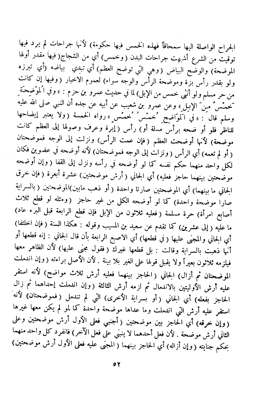(وَخَمْسٌ) أَيْ مِنْ الشِّجَاجِ (فِيهَا مُقَدَّرٌ أَوَّلُهَا الْمُوضِحَةُ) وَالْوَضَحُ الْبَيَاضُ (وَهِيَ الَّتِي تُوَضِّحُ الْعَظْمَ) أَيْ تُبْدِي بَيَاضَهُ (أَيْ تُبْرِزْهُ وَلَوْ بِقَدْرِ رَأْسِ بِزَّةٍ وَمُوضِحَةُ الرَّأْسِ وَالْوَجْهِ سَوَاءٌ) لِعُمُومِ الْأَخْبَارِ (وَفِيهَا إنْ كَانَتْ مِنْ حُرٍّ مُسْلِمٍ وَلَوْ أُنْثَى خَمْسٌ مِنْ الْإِبِلِ) لِمَا فِي حَدِيثِ عَمْرِو بْن حَزْمٍ: «وَفِي الْمُوضِحَةِ خَمْسٌ مِنْ الْإِبِلِ» وَعَنْ عَمْرِو بْنِ شُعَيْبٍ عَنْ أَبِيهِ عَنْ جَدِّهِ أَنَّ النَّبِيَّ - صَلَّى اللَّهُ عَلَيْهِ وَسَلَّمَ - قَالَ: «فِي الْمَوَاضِحِ خَمْسٌ خَمْسٌ» رَوَاهُ الْخَمْسَةُ (وَلَا يُعْتَبَرُ إيضَاحُهَا لِلنَّاظِرِ فَلَوْ أَوْضَحَهُ بِرَأْسِ مِسَلَّةٍ أَوْ) رَأْسِ (إبْرَةٍ وَعَرَفَ وُصُولَهَا إلَى الْعَظْمِ كَانَتْ مُوضِحَةُ) لِأَنَّهَا أَوَضَحَتْ الْعَظْمَ (فَإِنْ عَمَّتْ الرَّأْسَ) وَنَزَلَتْ إلَى الْوَجْهِ فَمُوضِحَتَانِ (أَوْ لَمْ تَعُمُّهُ) أَيْ الرَّأْسَ (وَنَزَلَتْ إلَى الْوَجْهِ فَمُوضِحَتَانِ) لِأَنَّهُ أَوْضَحَهُ فِي عُضْوَيْنِ فَكَانَ لِكُلِّ وَاحِدٍ مِنْهُمَا حُكْمُ نَفْسِهِ كَمَا لَوْ أَوْضَحَهُ فِي رَأْسٍ وَنَزَلَ إلَى الْقَفَا.