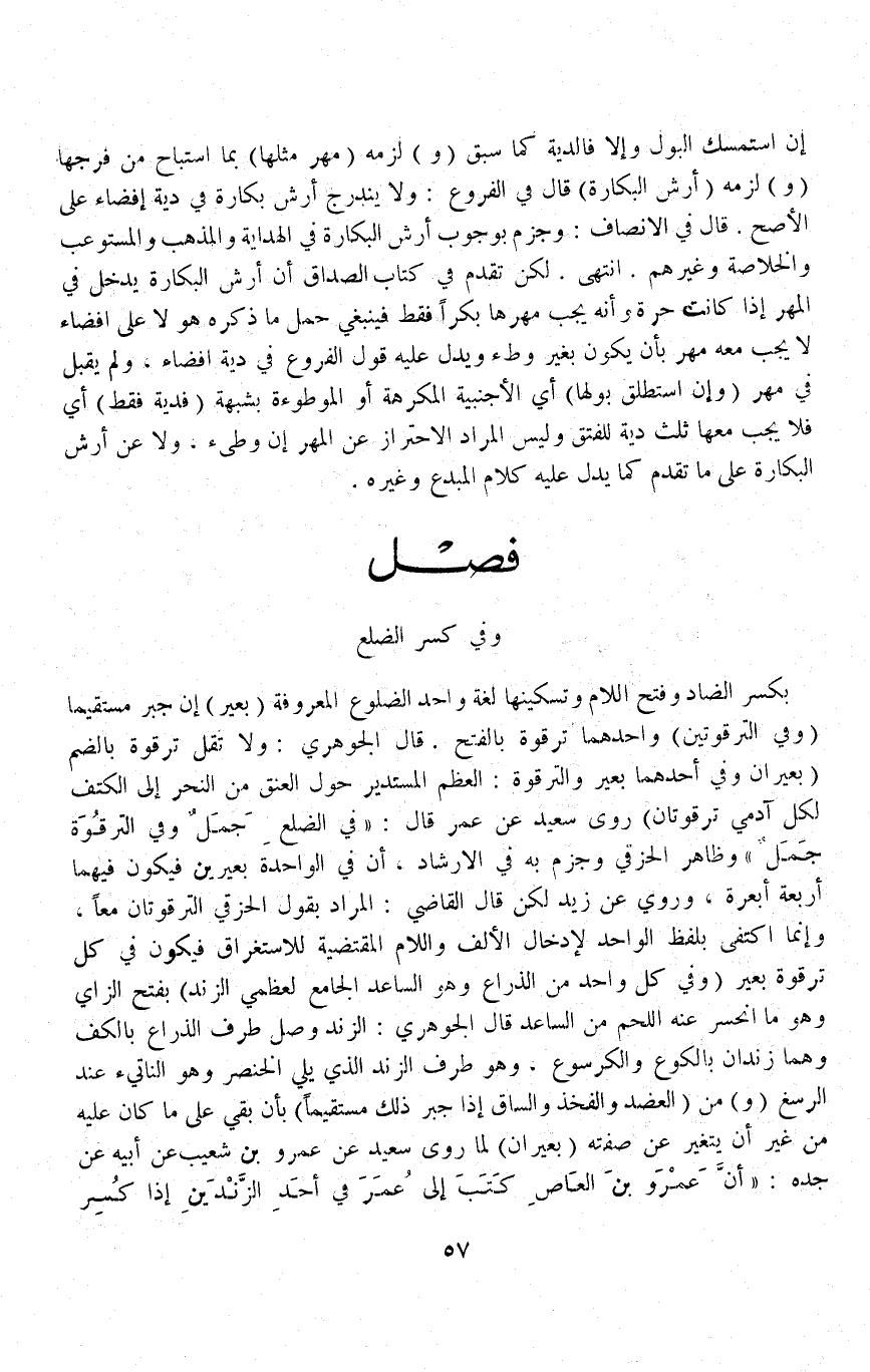 (فَصْلٌ وَفِي كَسْرِ الضِّلْعِ) بِكَسْرِ الضَّادِ وَفَتْحِ اللَّامِ وَتَسْكِينِهَا لُغَةٌ وَاحِدُ الضُّلُوعِ الْمَعْرُوفَةِ (بَعِيرٍ) إنْ جُبِرَ مُسْتَقِيمًا (وَفِي التَّرْقُوَتَيْنِ) وَاحِدُهُمَا تَرْقُوَةٌ بِالْفَتْحِ قَالَ الْجَوْهَرِيُّ: وَلَا تَقُلْ تَرْقُوَة بِالضَّمِّ (بَعِيرَانِ وَفِي أَحَدِهِمَا بَعِيرٌ وَالتَّرْقُوَةُ: الْعَظْمُ الْمُسْتَدِيرُ حَوْلَ الْعُنُقِ مِنْ النَّحْرِ إلَى الْكَتِفِ لِكُلِّ آدَمِيّ تَرْقُوَتَانِ) رَوَى سَعِيدٌ عَنْ عُمَرَ قَالَ: " فِي الضِّلْع جَمَلٌ وَفِي التَّرْقُوَةِ جَمَلٌ " وَظَاهِر الْخِرَقِيِّ وَجَزَمَ بِهِ فِي الْإِرْشَادِ أَنَّ فِي الْوَاحِدَةِ بَعِيرَيْنِ فَيَكُونُ فِيهِمَا أَرْبَعَةُ أَبْعِرَةٍ، وَرُوِيَ عَنْ زَيْدٍ لَكِنْ قَالَ الْقَاضِي: الْمُرَادُ بِقَوْلِ الْخِرَقِيِّ التَّرْقُوَتَانِ مَعًا وَإِنَّمَا اكْتَفَى بِلَفْظِ الْوَاحِدِ لِإِدْخَالِ الْأَلِفِ وَاللَّامِ الْمُقْتَضِيَةُ لِلِاسْتِغْرَاقِ فَيَكُونُ فِي كُلّ تَرْقُوَةٍ بَعِيرٌ.