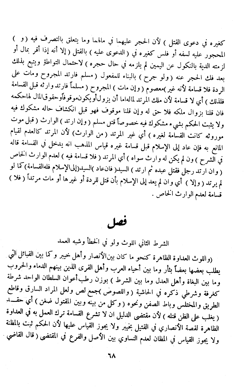 (فَصْلٌ) الشَّرْطُ (الثَّانِي اللَّوْثُ وَلَوْ فِي الْخَطَإِ وَشِبْهِ الْعَمْدِ وَاللَّوْثُ الْعَدَاوَةُ الظَّاهِرَةُ كَنَحْوِ مَا كَانَ بَيْنَ الْأَنْصَارِ وَأَهْلِ خَيْبَرَ وَكَمَا بَيْنَ الْقَبَائِلِ الَّتِي يَطْلُبُ بَعْضُهَا بَعْضًا بِثَأْرٍ وَمَا بَيْنَ أَحْيَاءِ الْعَرَبِ وَأَهْلِ الْقُرَى الَّذِينَ بَيْنَهُمْ الدِّمَاءُ وَالْحُرُوبُ وَمَا بَيْنَ الْبُغَاةِ وَأَهْلِ الْعَدْلِ وَمَا بَيْنَ الشُّرَط) بِوَزْنِ رُطَب أَعْوَانُ السُّلْطَانِ الْوَاحِدِ شُرْطَة كَغُرْفَةِ وَشُرْطِيِّ ذَكَرَهُ فِي الْحَاشِيَةِ (وَاللُّصُوصُ) جَمْعُ لِصٍّ وَلَعَلَّ الْمُرَادَ السَّارِقُ وَقَاطِعُ الطَّرِيقِ وَالْمُخْتَلِسُ وَبَاطُّ الصَّفَنِ وَنَحْوِهِ.