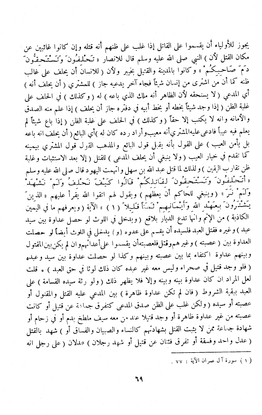 (وَيَنْبَغِي لِلْحَاكِمِ أَنْ يَعِظَهُمْ) وَيَقُولُ لَهُمْ اتَّقُوا اللَّهَ يَقْرَأُ عَلَيْهِمْ {الَّذِينَ يَشْتَرُونَ بِعَهْدِ اللَّهِ وَأَيْمَانِهِمْ ثَمَنًا قَلِيلا} [آل عمران: ٧٧] الْآيَةَ (وَيُعَرِّفهُمْ مَا فِي الْيَمِينِ الْكَاذِبَةِ) مِنْ الْإِثْمِ وَإِنَّهَا تَدَعُ الدِّيَارَ بَلَاقِعَ (وَيَدْخُلُ فِي اللَّوْث لَوْ حَصَلَ عَدَاوَةٌ بَيْن سَيِّدِ عَبْدٍ) وَغَيْرِهِ فَقَتَلَ الْعَبْدَ فَلِسَيِّدِهِ أَنْ يُقْسِمَ عَلَى عَدُوِّهِ (وَ) يَدْخُلُ فِيهَا اللَّوْثُ أَيْضًا لَوْ حَصَلَتْ الْعَدَاوَةُ بَيْنَ (عَصَبَتِهِ) وَغَيْرِهِمْ وَقُتِلَ فَلِعَصَبَتِهِ أَنْ يُقْسِمُوا عَلَى أَعْدَائِهِمْ وَإِنْ لَمْ يَكُنْ بَيْنَ الْمَقْتُولِ وَبَيْنَهُمْ عَدَاوَةٌ اكْتِفَاءً بِمَا بَيْن عَصَبَتِهِ وَبَيْنَهُمْ وَكَذَا لَوْ حَصَلَتْ عَدَاوَةٌ بَيْن سَيِّدٍ وَعَبْدِهِ (فَلَوْ وُجِدَ قَتِيلٌ فِي صَحْرَاءَ وَلَيْسَ مَعَهُ غَيْرَ عَبْدِهِ كَانَ ذَلِكَ لَوْثًا فِي حَقِّ الْعَبْدِ) .
