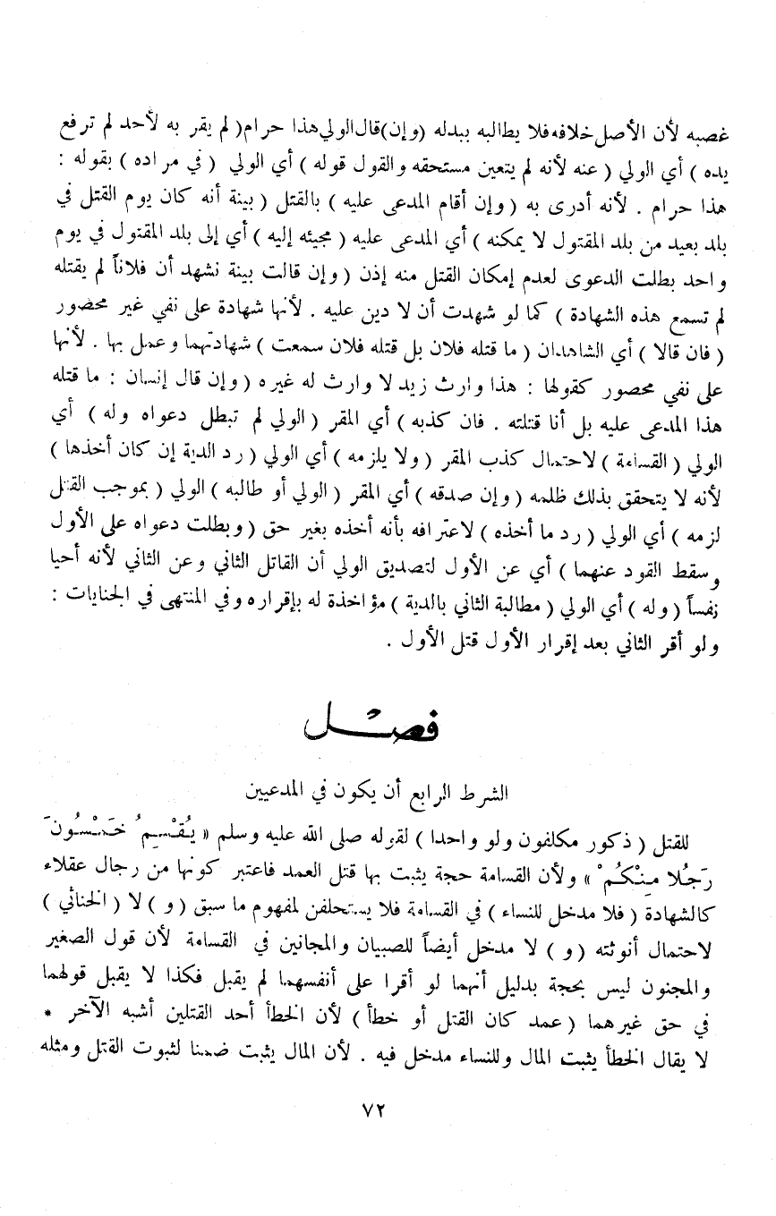 (فَصْلٌ) الشَّرْطُ (الرَّابِعُ أَنْ يَكُونَ فِي الْمُدَّعِيَيْنِ) لِلْقَتْلِ (ذُكُورٌ مُكَلَّفُونَ وَلَوْ وَاحِدًا) لِقَوْلِهِ - صَلَّى اللَّهُ عَلَيْهِ وَسَلَّمَ - «يُقْسِمُ خَمْسُونَ رَجُلًا مِنْكُمْ» وَلِأَنَّ الْقَسَامَةَ حُجَّةٌ يَثْبُتُ بِهَا قَتْلُ الْعَمْدِ فَاعْتُبِرَ كَوْنُهَا مِنْ رِجَالٍ عُقَلَاءَ كَالشَّهَادَةِ (فَلَا مَدْخَلَ لِلنِّسَاءِ) فِي الْقَسَامَةِ فَلَا يُسْتَحْلَفْنَ لِمَفْهُومِ مَا سَبَقَ.