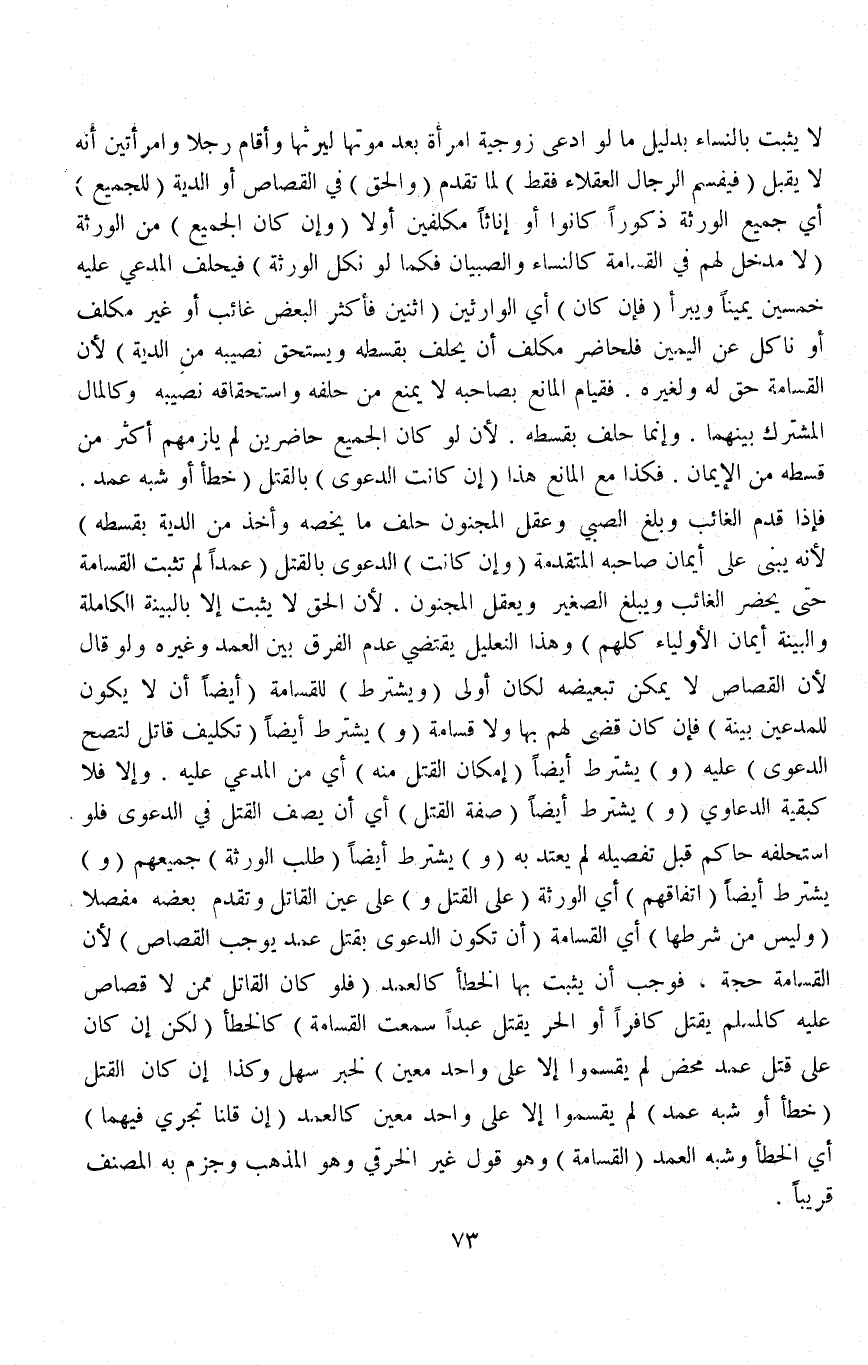 (وَيُشْتَرَط) لِلْقَسَامَةِ (أَيْضًا أَنْ لَا يَكُونَ لِلْمُدَّعِينَ بَيِّنَةٌ) فَإِنْ كَانَ قُضِيَ لَهُمْ بِهَا وَلَا قَسَامَةَ (وَ) يُشْتَرَطُ أَيْضًا (تَكْلِيفُ قَاتِلٍ لِتَصِحَّ الدَّعْوَى) عَلَيْهِ (وَ) يُشْتَرَط أَيْضًا (إمْكَانُ الْقَتْلِ مِنْهُ) أَيْ مِنْ الْمُدَّعَى عَلَيْهِ وَإِلَّا فَلَا كَبَقِيَّةِ الدَّعَاوَى (وَ) يُشْتَرَطُ أَيْضًا (صِفَةُ الْقَتْلِ) أَيْ أَنْ يَصِفَ الْقَتْلَ فِي الدَّعْوَى فَلَوْ اسْتَحْلَفَهُ حَاكِمٌ قَبْلَ تَفْصِيلِهِ لَمْ يُعْتَدَّ بِهِ.