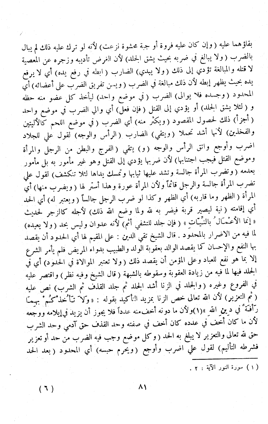 (قَالَ الشَّيْخُ وَفِيهِ نَظَرٌ) وَاقْتَصَرَ عَلَيْهِ فِي الْفُرُوعِ وَغَيْرِهِ (وَالْجَلْدُ فِي الزِّنَا أَشَدُّ الْجَلْدِ ثُمَّ جَلْدُ الْقَذْفِ ثُمَّ الشُّرْبِ) نَصَّ عَلَيْهِ (ثُمَّ التَّعْزِيرِ) لِأَنَّ اللَّهَ تَعَالَى خَصَّ الزِّنَا بِمَزِيدِ التَّأْكِيدِ بِقَوْلِهِ {وَلا تَأْخُذْكُمْ بِهِمَا رَأْفَةٌ فِي دِينِ اللَّهِ} [النور: ٢] وَلِأَنَّ مَا دُونَهُ أَخَفُّ مِنْهُ عَدَدًا فَلَا يَجُوزُ أَنْ يَزِيدَ فِي إيلَامِهِ وَوَجَعِهِ لِأَنَّ مَا كَانَ أَخَفَّ فِي عَدَدِهِ كَانَ أَخَفَّ فِي صِفَتِهِ وَحَدُّ الْقَذْفِ حَقُّ آدَمِيٍّ وَحَدُّ الشُّرْبِ حَقٌّ لِلَّهِ تَعَالَى وَالتَّعْزِيرُ لَا يَبْلُغُ بِهِ الْحَدَّ.