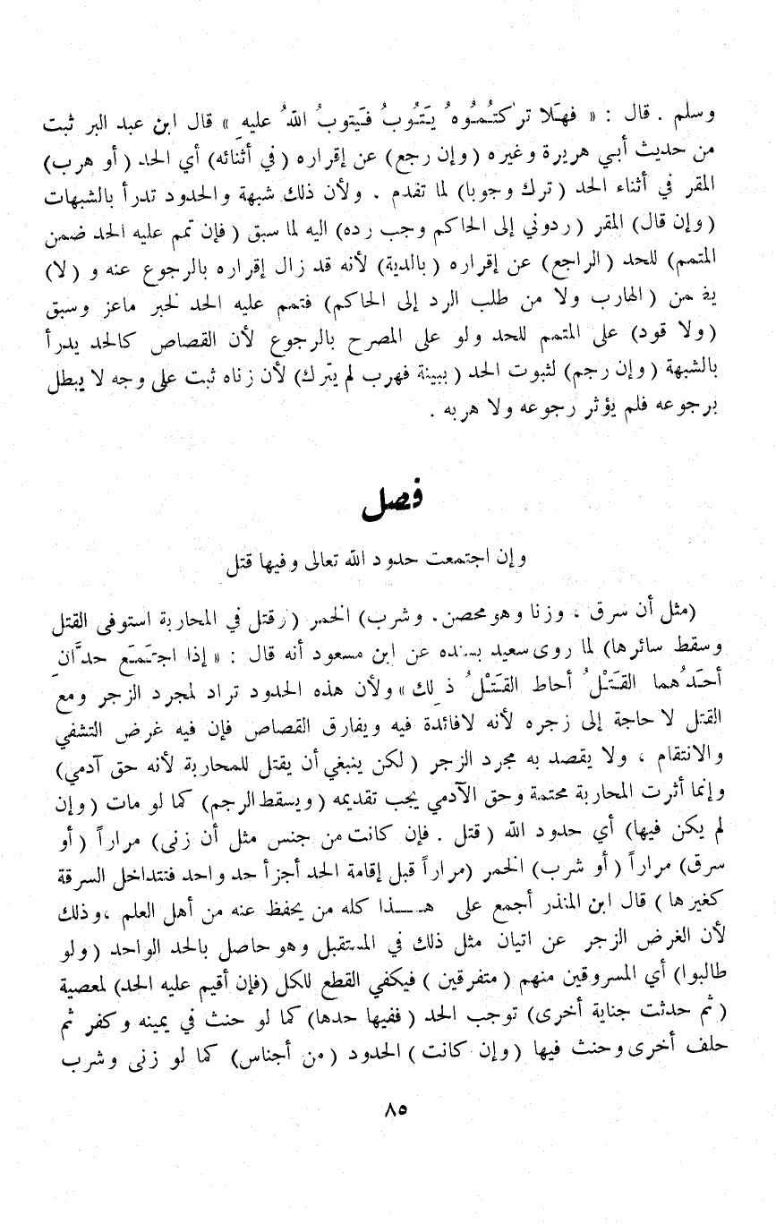 (فَصْلٌ وَإِنْ اجْتَمَعَتْ حُدُودُ اللَّهِ) تَعَالَى (وَفِيهَا قَتْل مِثْلَ أَنْ سَرَقَ وَزَنَا وَهُوَ مُحْصَنٌ وَشَرِبَ) الْخَمْرَ (وَقُتِلَ فِي الْمُحَارَبَةِ اسْتَوْفِي الْقَتْلَ وَسَقَطَ سَائِرُهَا) لِمَا رَوَى سَعِيدٌ بِسَنَدِهِ عَنْ ابْنِ مَسْعُودٍ أَنَّهُ قَالَ: " إذَا اجْتَمَعَ حَدَّانِ أَحَدُهُمَا الْقَتْلُ أَحَاطَ الْقَتْلُ ذَلِكَ وَلِأَنَّ هَذِهِ الْحُدُودُ تُرَادُ لِمُجَرَّدِ الزَّجْرِ وَمَعَ الْقَتْلِ لَا حَاجَةَ إلَى زَجْرِهِ لِأَنَّهُ لَا فَائِدَةَ فِيهِ وَيُفَارِقُ الْقِصَاصَ فَإِنَّ فِيهِ غَرَضَ التَّشَفِّي وَالِانْتِقَامِ وَلَا يُقْصَدُ بِهِ مُجَرَّدُ الزَّجْرِ (لَكِنْ يَنْبَغِي أَنْ يُقْتَلَ لِلْمُحَارِبَةِ لِأَنَّهُ حَقُّ آدَمِيٍّ) وَإِنَّمَا أُثِرَتْ الْمُحَارَبَةُ مُحَتَّمَةً وَحَقُّ الْآدَمِيِّ يَجِبُ تَقْدِيمُهُ (وَيَسْقُطُ الرَّجْمُ) كَمَا لَوْ مَاتَ (وَإِنْ لَمْ يَكُنْ فِيهَا) أَيْ حُدُودِ اللَّهِ (قَتْلٌ فَإِنْ كَانَتْ مِنْ جِنْسِ مِثْل أَنْ زَنَى) مِرَارًا (أَوْ سَرَقَ) مِرَارًا (أَوْ شَرِبَ) الْخَمْرَ (مِرَارًا قَبْلَ إقَامَةِ الْحَدِّ أَجْزَأَ حَدٌّ وَاحِدٌ فَتَتَدَاخَلُ السَّرِقَةُ كَغَيْرِهَا) قَالَ ابْنُ الْمُنْذِر أَجْمَع عَلَى هَذَا كُلِّهِ مَنْ يُحْفَظُ عَنْهُ مِنْ أَهْلِ الْعِلْمِ وَذَلِكَ لِأَنَّ الْغَرَضَ الزَّجْرُ عَنْ إتْيَانِ مِثْلِ ذَلِكَ فِي الْمُسْتَقْبَلِ وَهُوَ حَاصِلٌ بِالْحَدِّ الْوَاحِدِ.